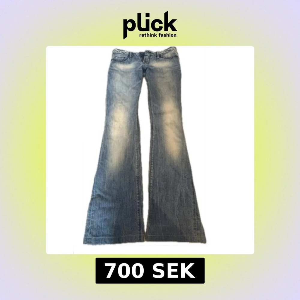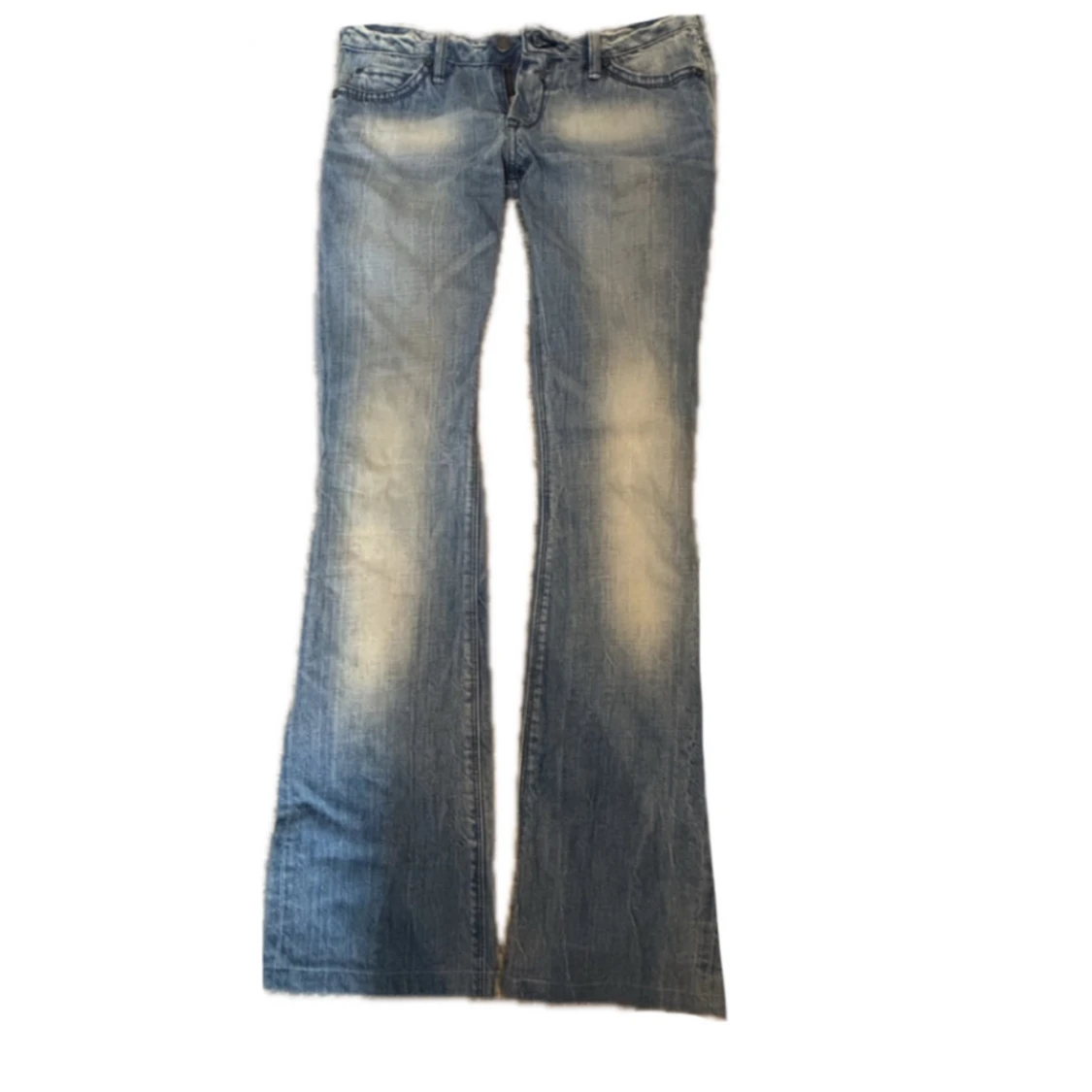 Snygga blå bootcut jeans med slitningar och ljusa partier framtill. Baktill finns två fickor med dekorativa sömmar och små nitar. Jeansen har klassisk femficksdesign och låg midja, perfekta för dig som gillar retrovibbar och coola detaljer.