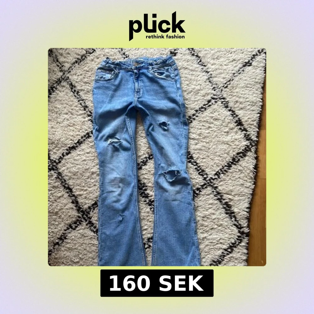 säljer dessa snygga ljusablå jeans med hål. Smått använda men inga defekter förutom en liten prick (se bild 5) syns inte o kan kanske gå bort i tvätten 💘i strl 158 motsvarar ungefär en xs, från gina young 💕skriv för mått, low -midwaist.