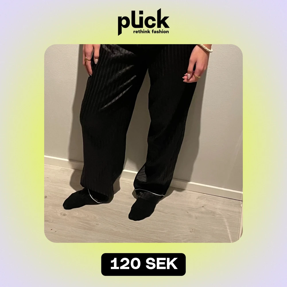 Säljer ett par svarta byxor med diskreta ränder. De har en loose passform och är perfekta för både vardag. Materialet ser ut att vara mjukt och bekvämt, vilket gör dem idealiska för höst och vinter. Byxorna har en elastisk midja för extra komfort.