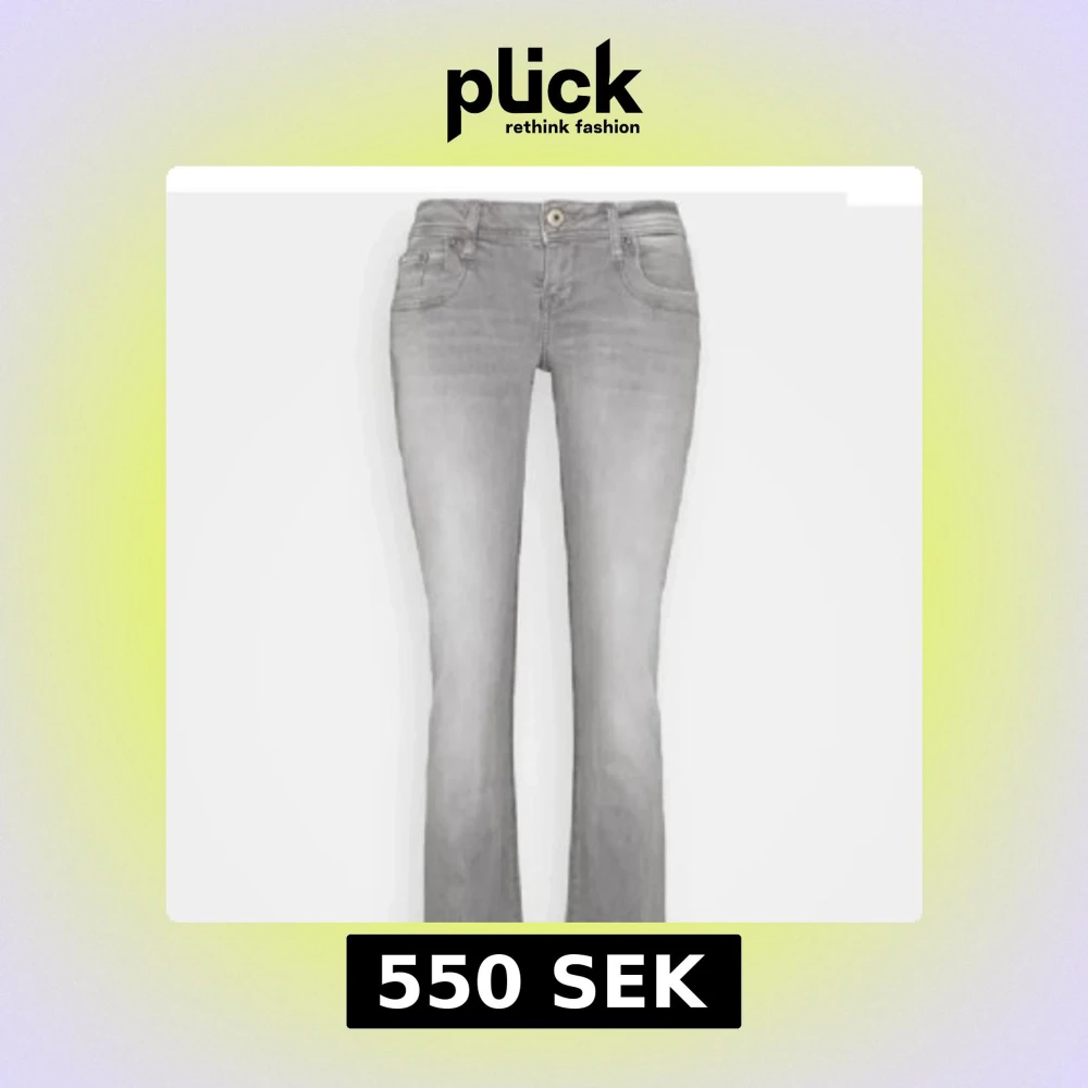 Snygga, populära, gråa, bootcut jeans med en klassisk femficksdesign och knappgylf. Perfekta för en avslappnad stil med en touch av retro. De har en bekväm passform och är tillverkade i ett mjukt material. Endast lite trasiga vid slutet av ”fötterna” eller benen”. Midjan: 41 cm. Innerbenslängd: 84 cm.