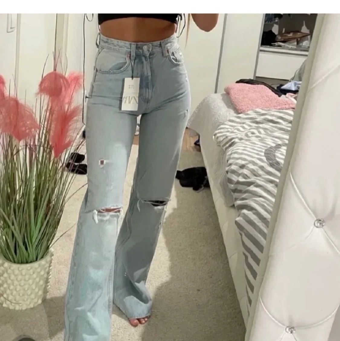 Säljer dessa eftertraktade slutsålda Zara jeans⚡️ I modellen 90s full lenght💕 Sparsamt använda så därför inga defekter🍀 I storlek 32, är 168 cm och dom är perfekt längd på mig❤️ Säljer då dom inte kommer till användning💕Lånad bild!