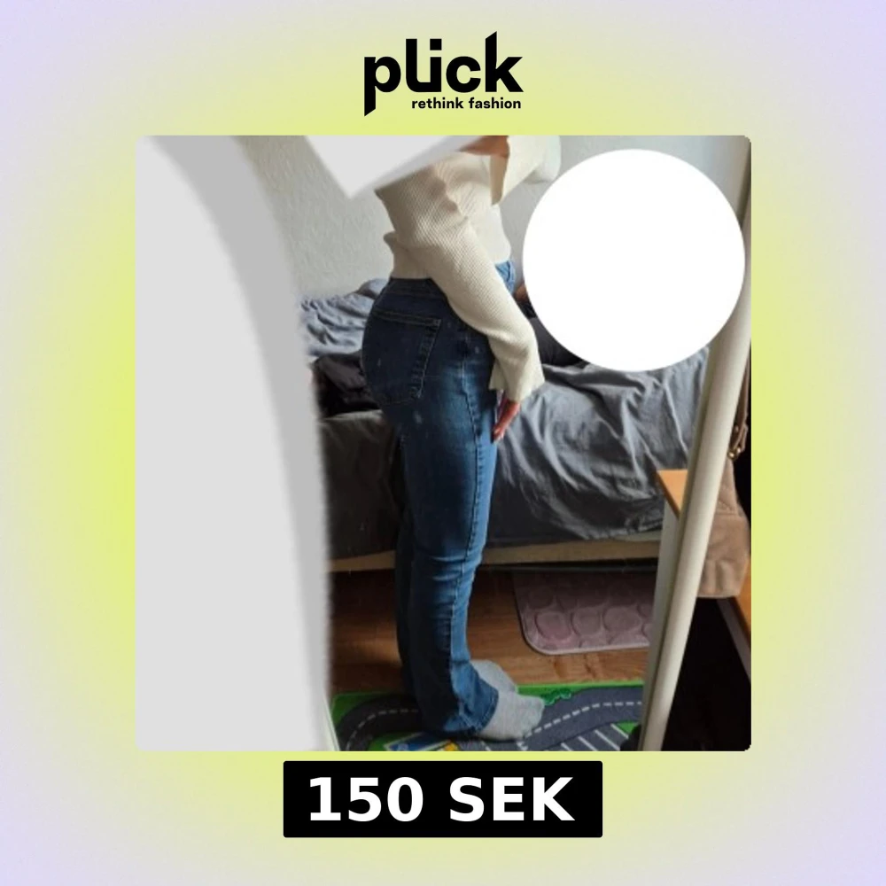 Säljer ett par klassiska blåa utsvängda jeans från Gina Tricot i storlek 36. Jeansen har normal passform, raka ben och femficksmodell. De är tillverkade i jeansmaterial med snygga kontrastsömmar och är högmidjade. Perfekta till vardagslooken!
