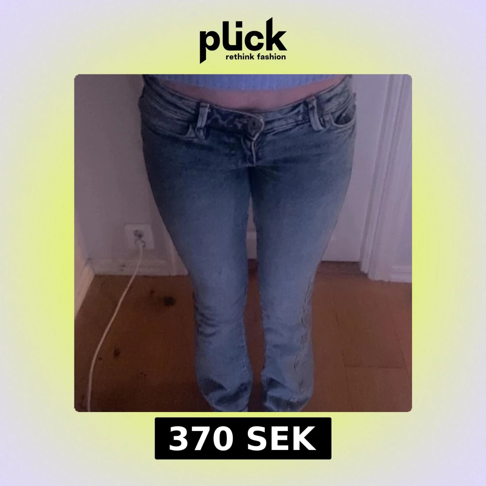 Säljer ett par ljusblå jeans med väldigt låg midja och snygga broderade detaljer på bakfickorna. Jeansen har klassisk femficksdesign, dragkedja och knapp framtill. Perfekta för en avslappnad och trendig look. (Använda 3 gånger) nypris 599kr