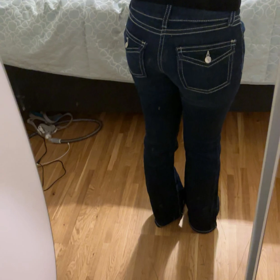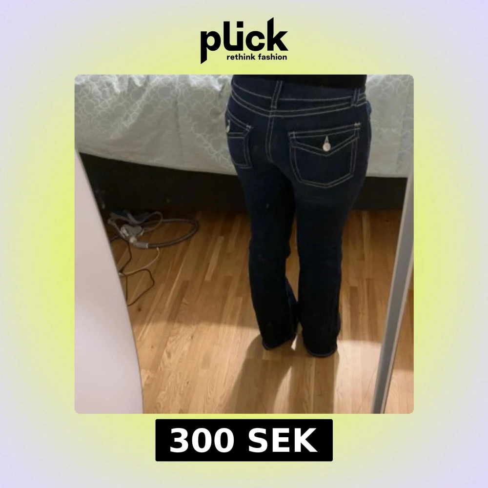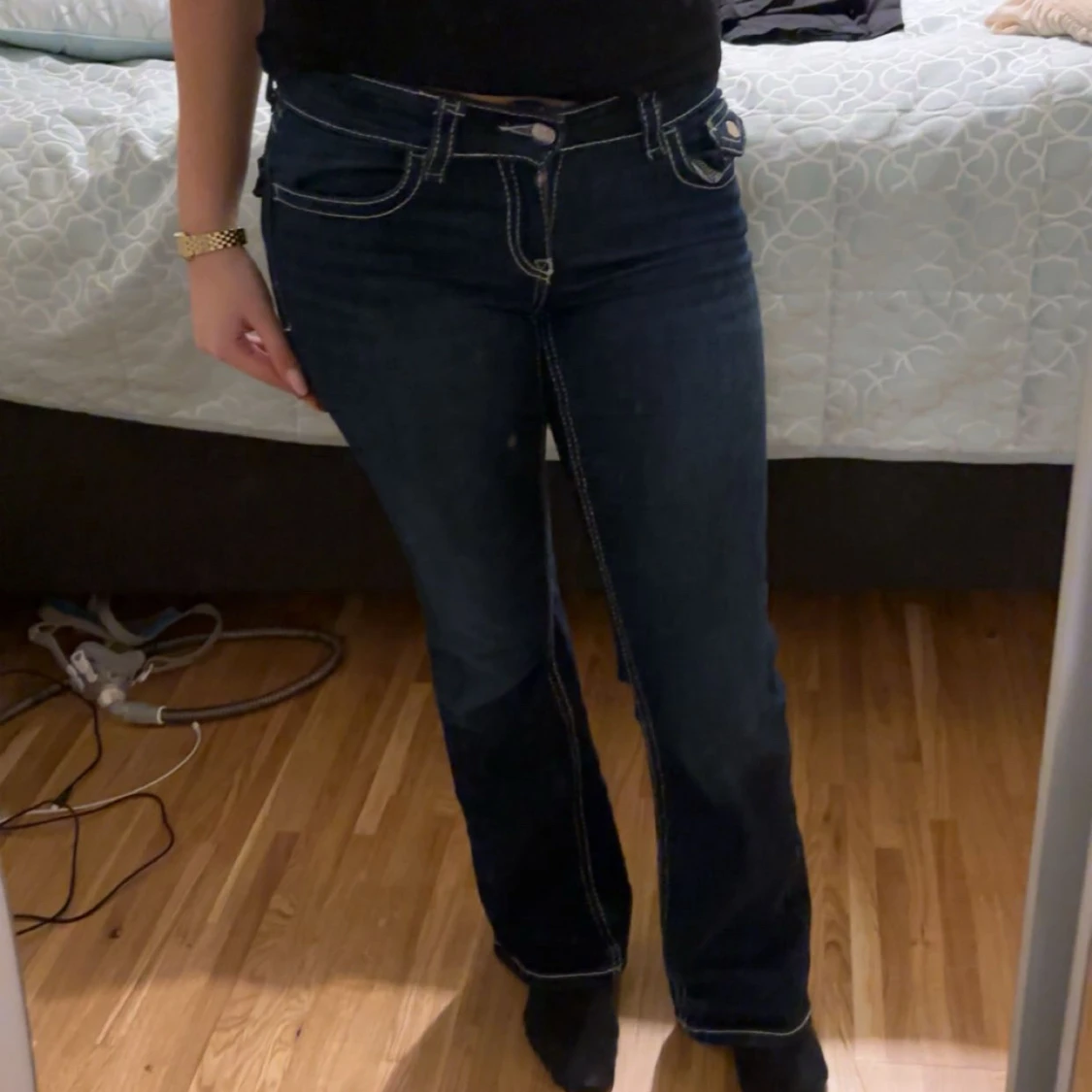 Snygga mörkblå jeans med tydliga vita kontrastsömmar och bootcut passform. Byxorna har klassiska fickor med lock och knappdetaljer bak, samt låg midja. Storleken ör 158 och byxorna är ej använda. Pris går att diskuteras! 🥰
