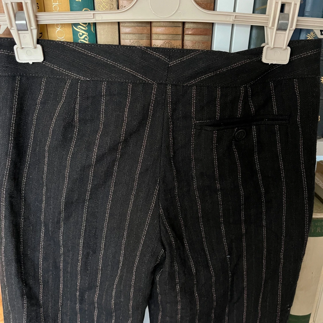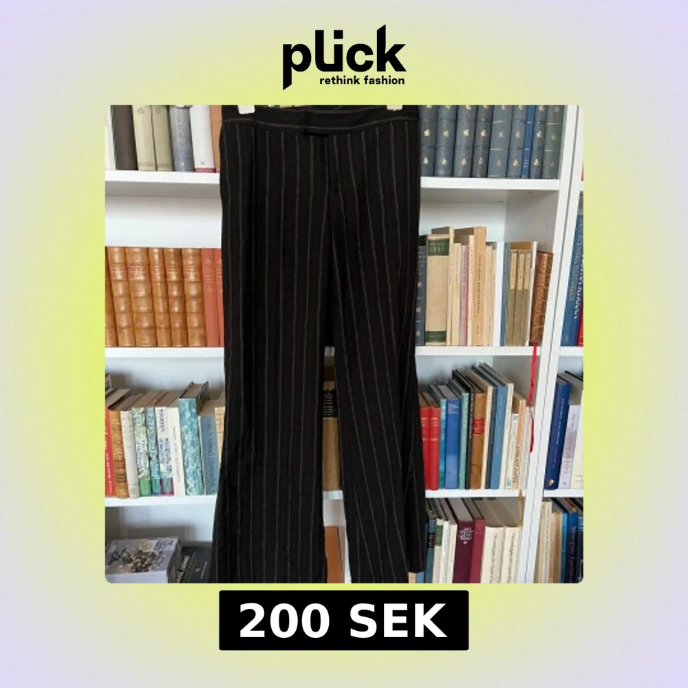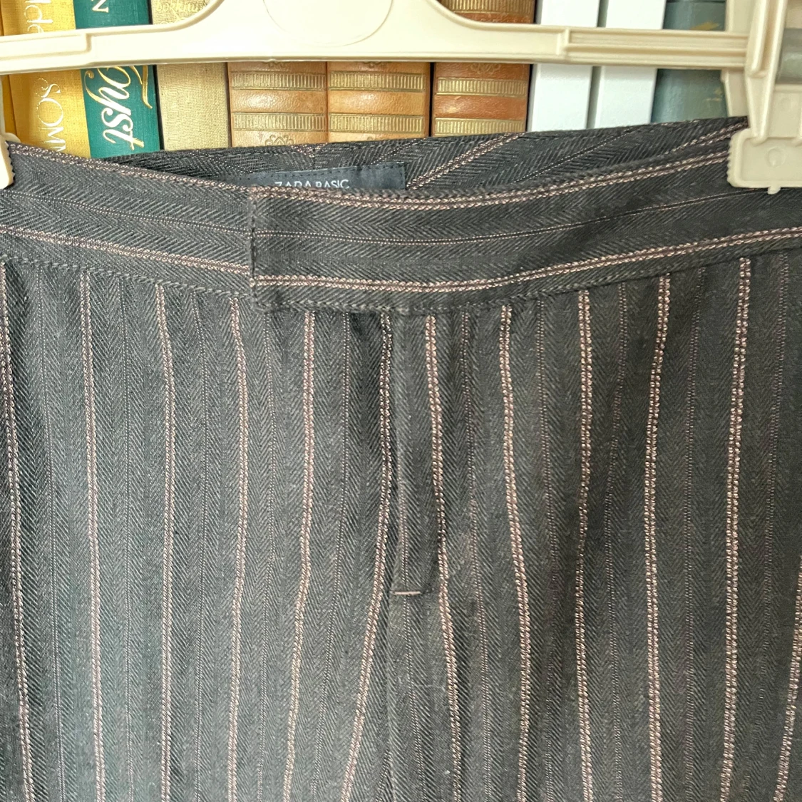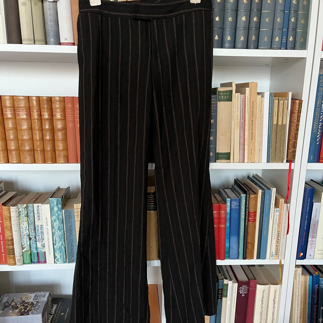Snygga svarta/mörkgrå lågmidjade byxor med diskreta ränder från Zara Basic. Byxorna har en rak passform så det är lite tightare på låren och lösa från knäna neråt. Aldrig använda🖤