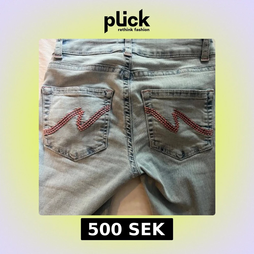 Ljusblå jeans från Nelly med rosa brodering på fickorna och hål vid knäna. Jättefina i väldigt bra skick endast lite slitningar längst ner i bak på ena benet,se bild ovanför. Skriv för fler bilder eller frågor.