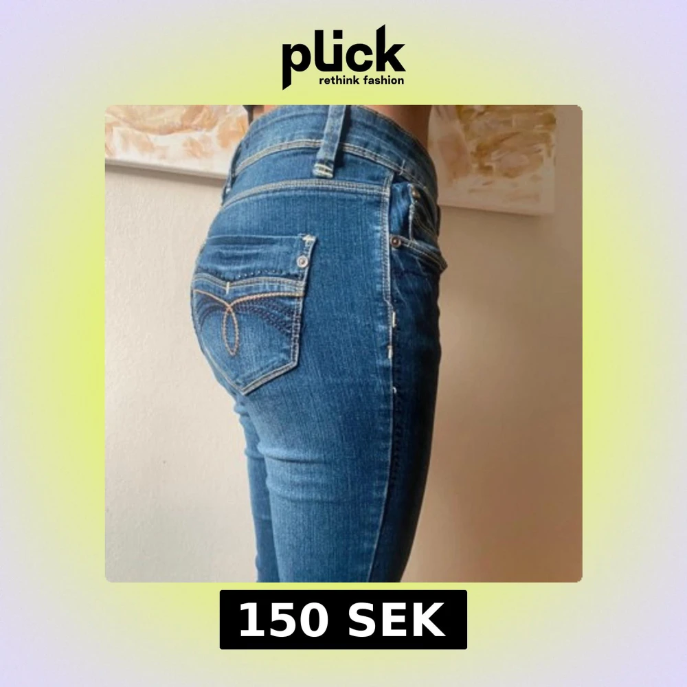 Säljer ett par blå skinny jeans med snygga broderade detaljer på bakfickan och dekorativa nitar. Jeansen har låg midja och klassisk femficksdesign. perfekt för både vardag och sommarens alla äventyr. Använda endast ett fåtal gånger, i mycket gott skick!