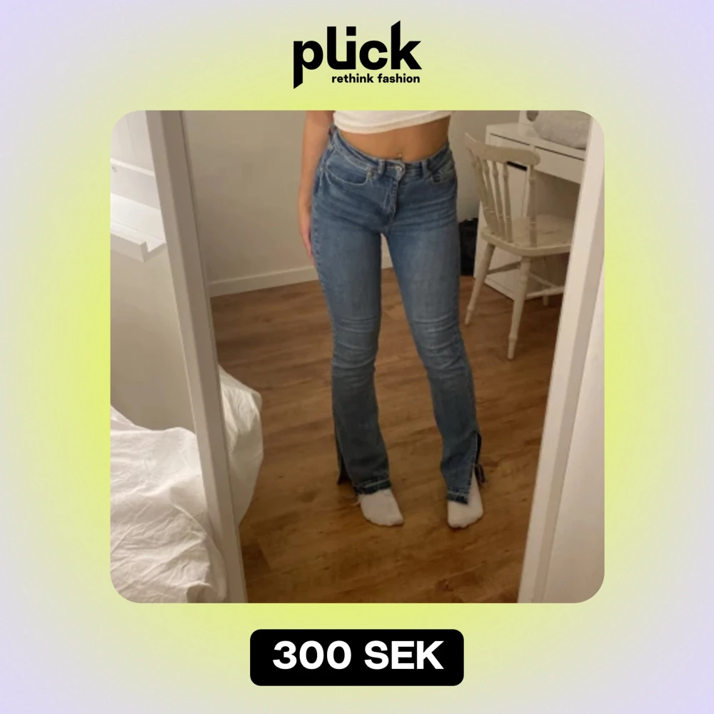 Säljer dessa superfina jeansen med slits ifrån HM!!🤍 väll använda men inga defekter! Högmidjade! Har sprättat upp sömmarna längst ner så dom ska bli längre då dom var lite korta för mig! Dom är i strl 34 men passar 36!🤍