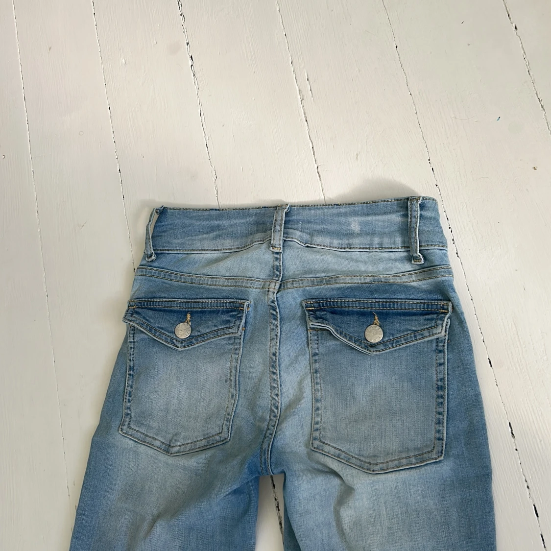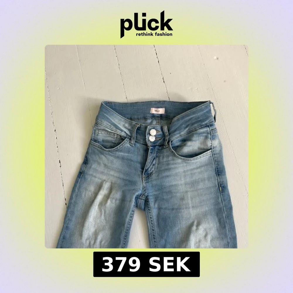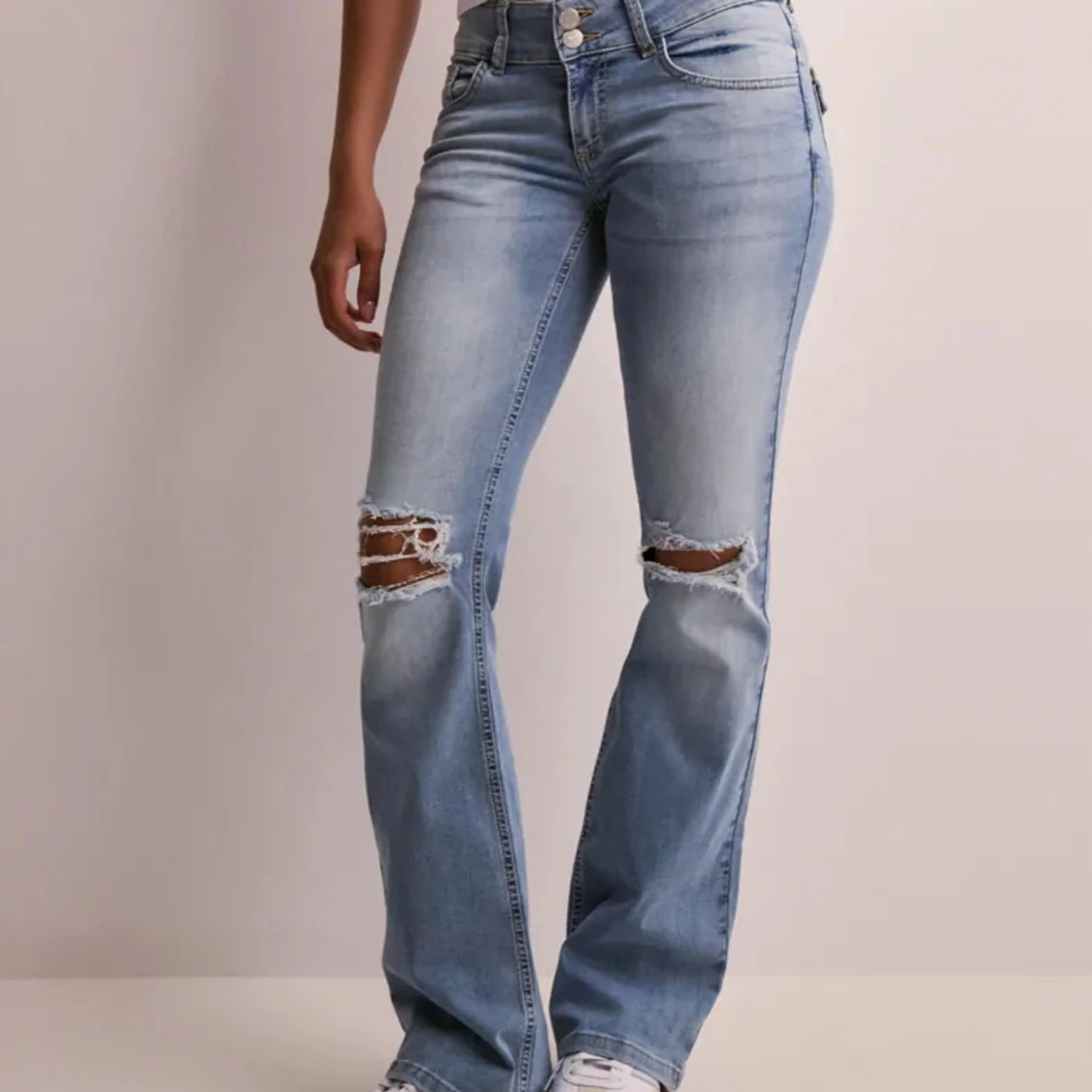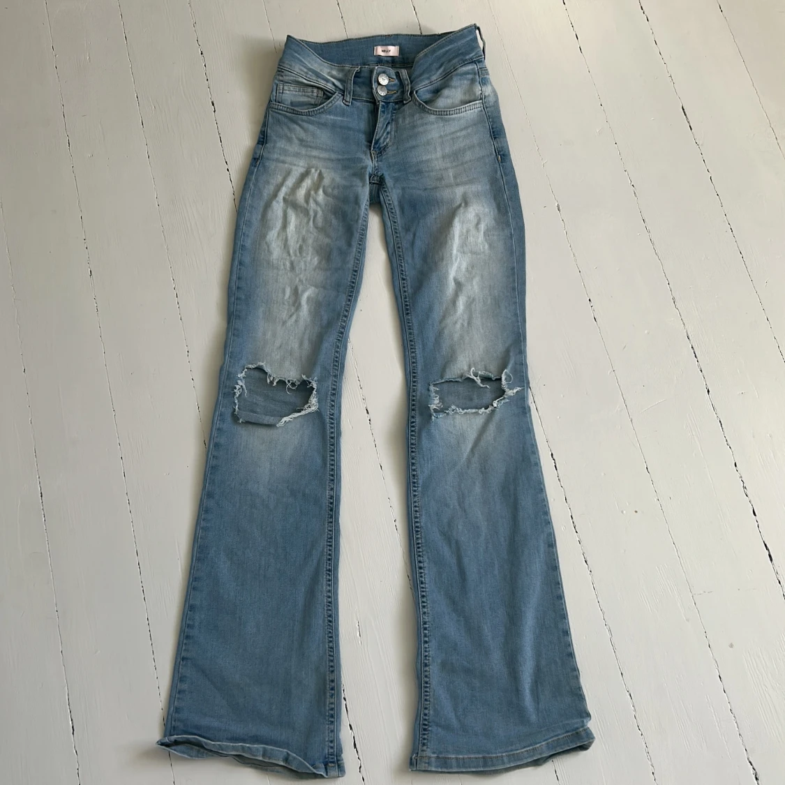 Säljer mina ljusblå lågmidjade bootcut jeans från Nelly med slitna detaljer vid knäna. Jag säljer dem för att de är för små tyvärr❤️ det är bara att skriva om ni har några funderingar 😚