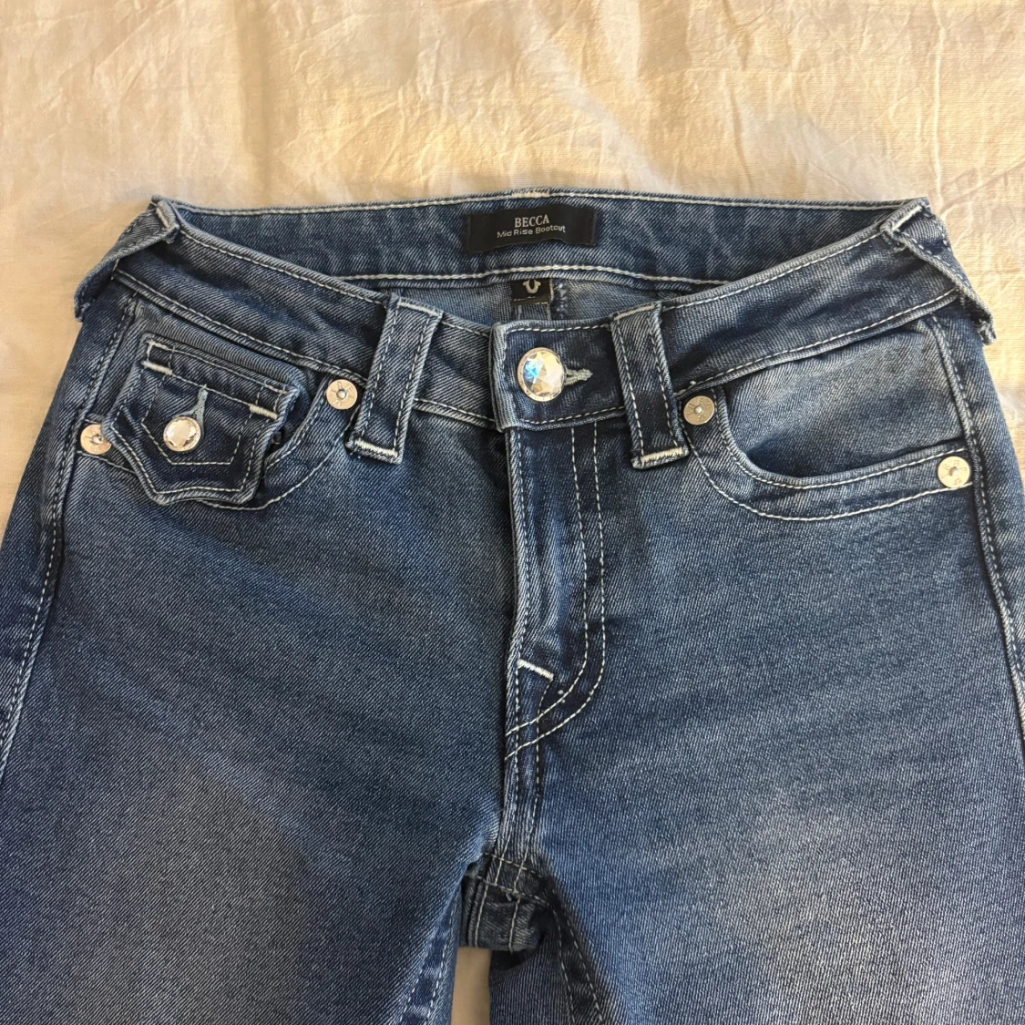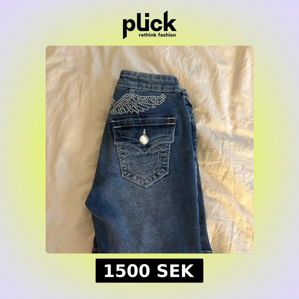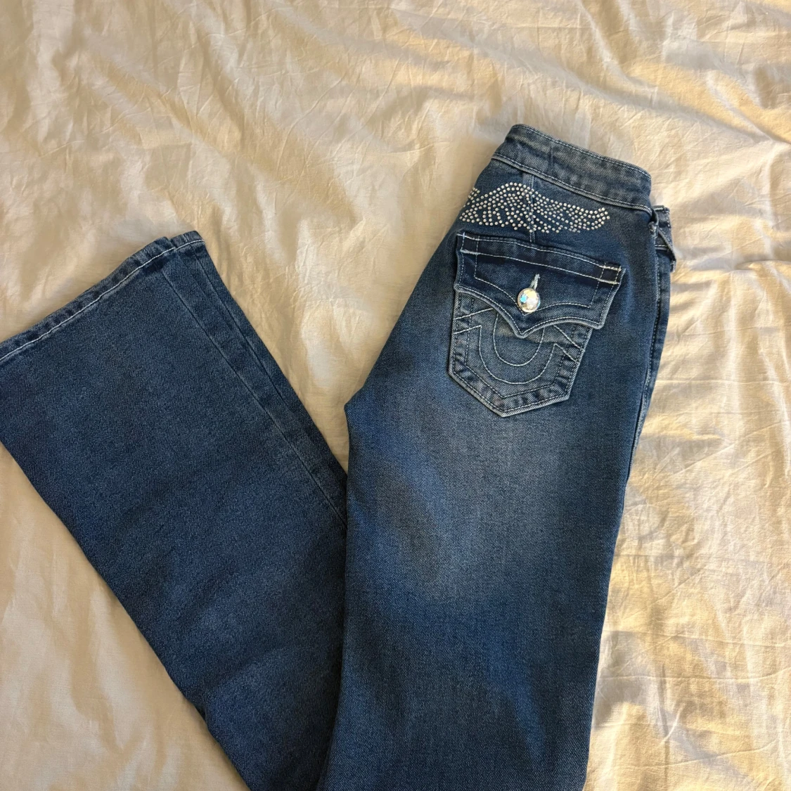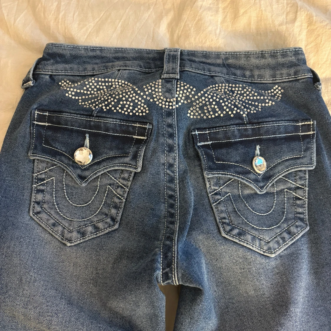 As snygga true religon jeans i storlek 25, aldrig använda! Diamant knappar, paljett vinge där bak. Dom heter BECCA. Köpta för 1700.