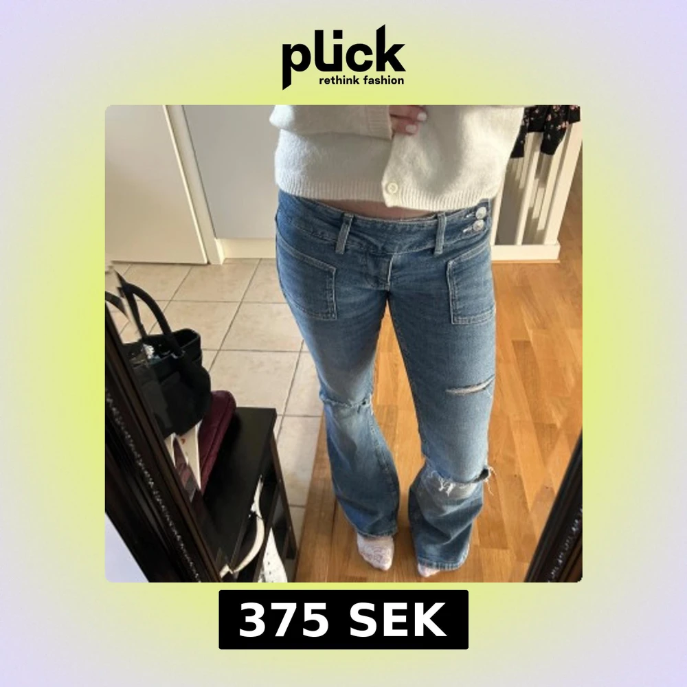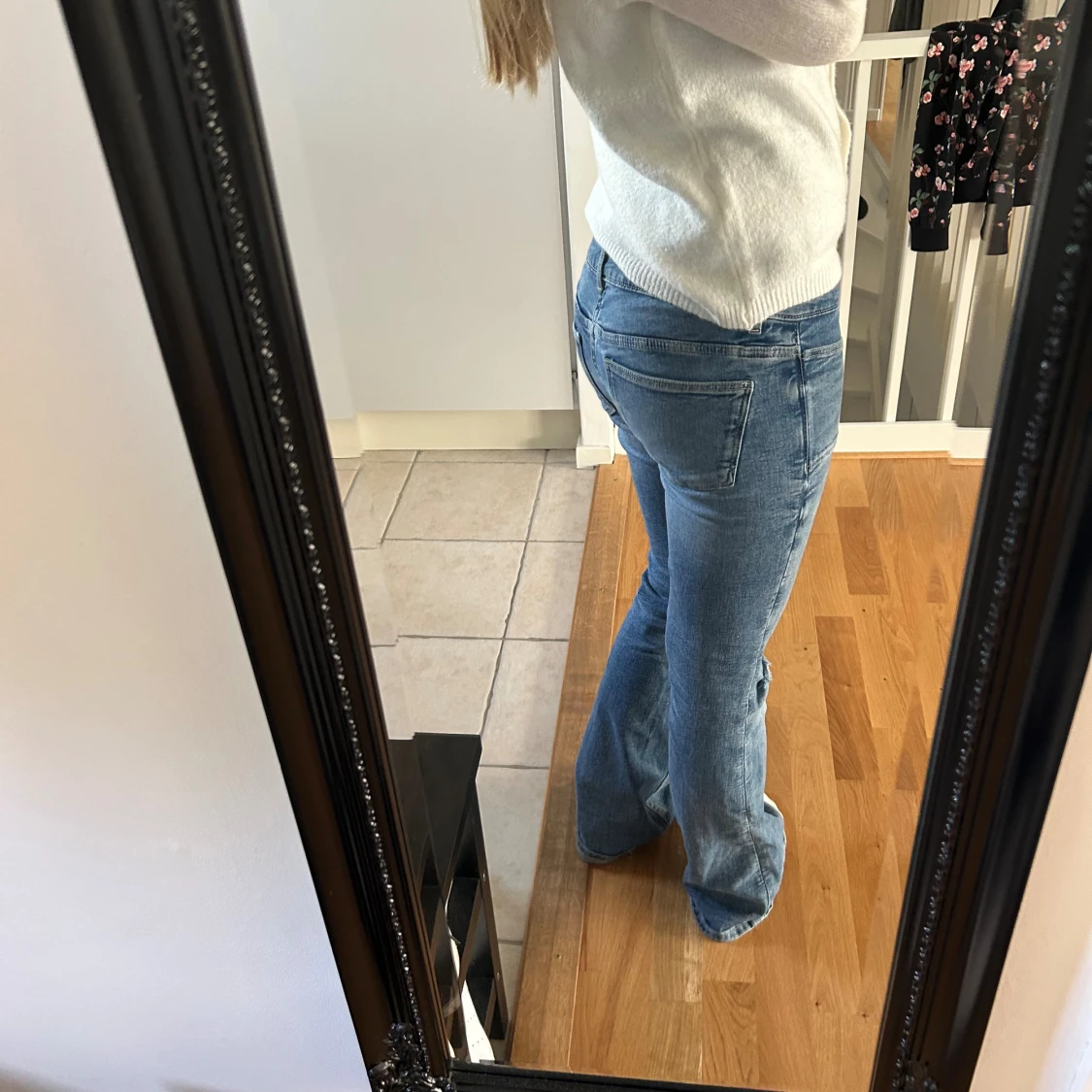 Säljer ett par ljusblå bootcut jeans med snygga slitningar på knäna och råa kanter. Jeansen har låg midja, dubbla knappar i linningen och stora framfickor. Perfekta för dig som gillar en avslappnad och trendig stil. Ginas trendiga jeans