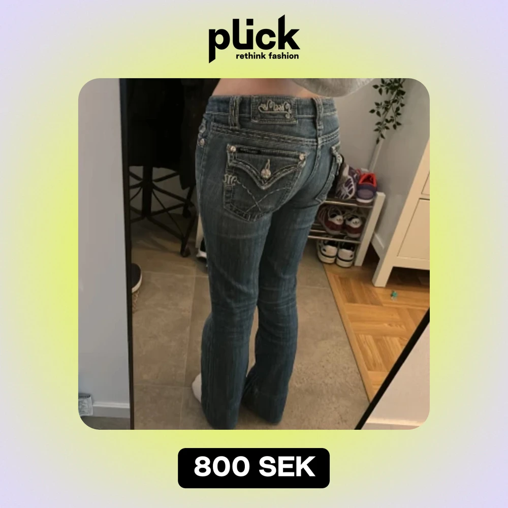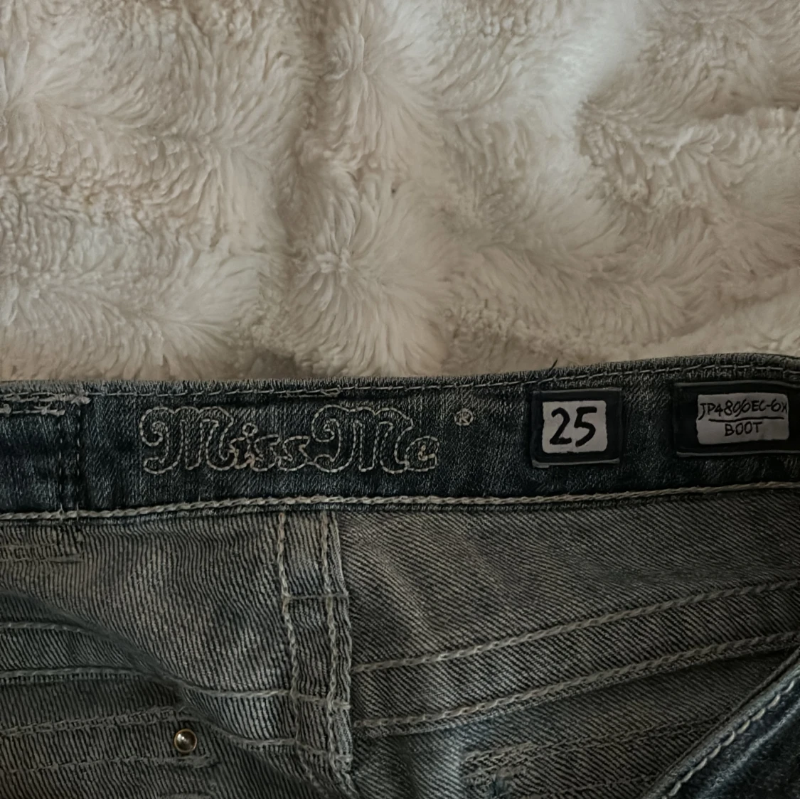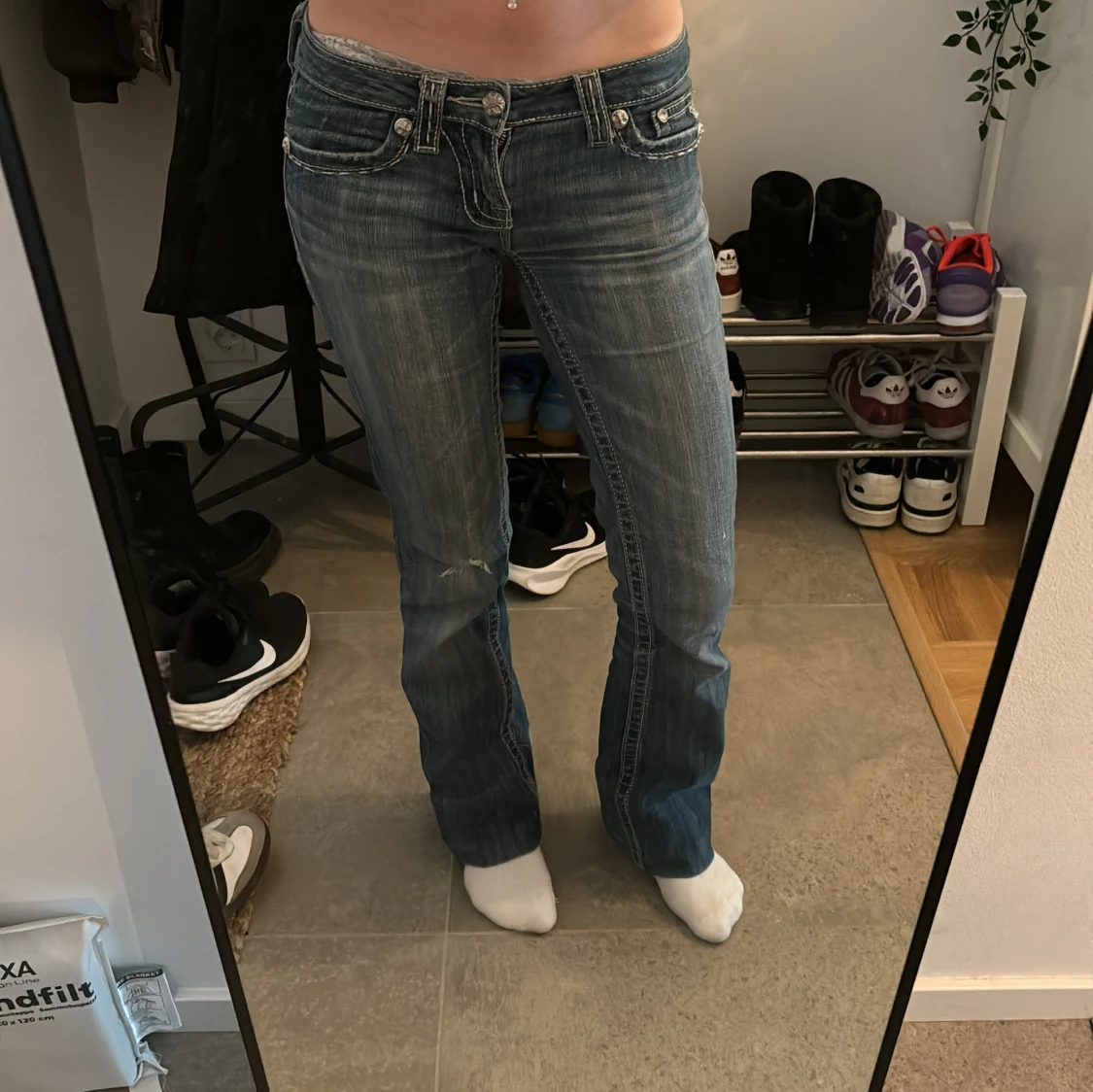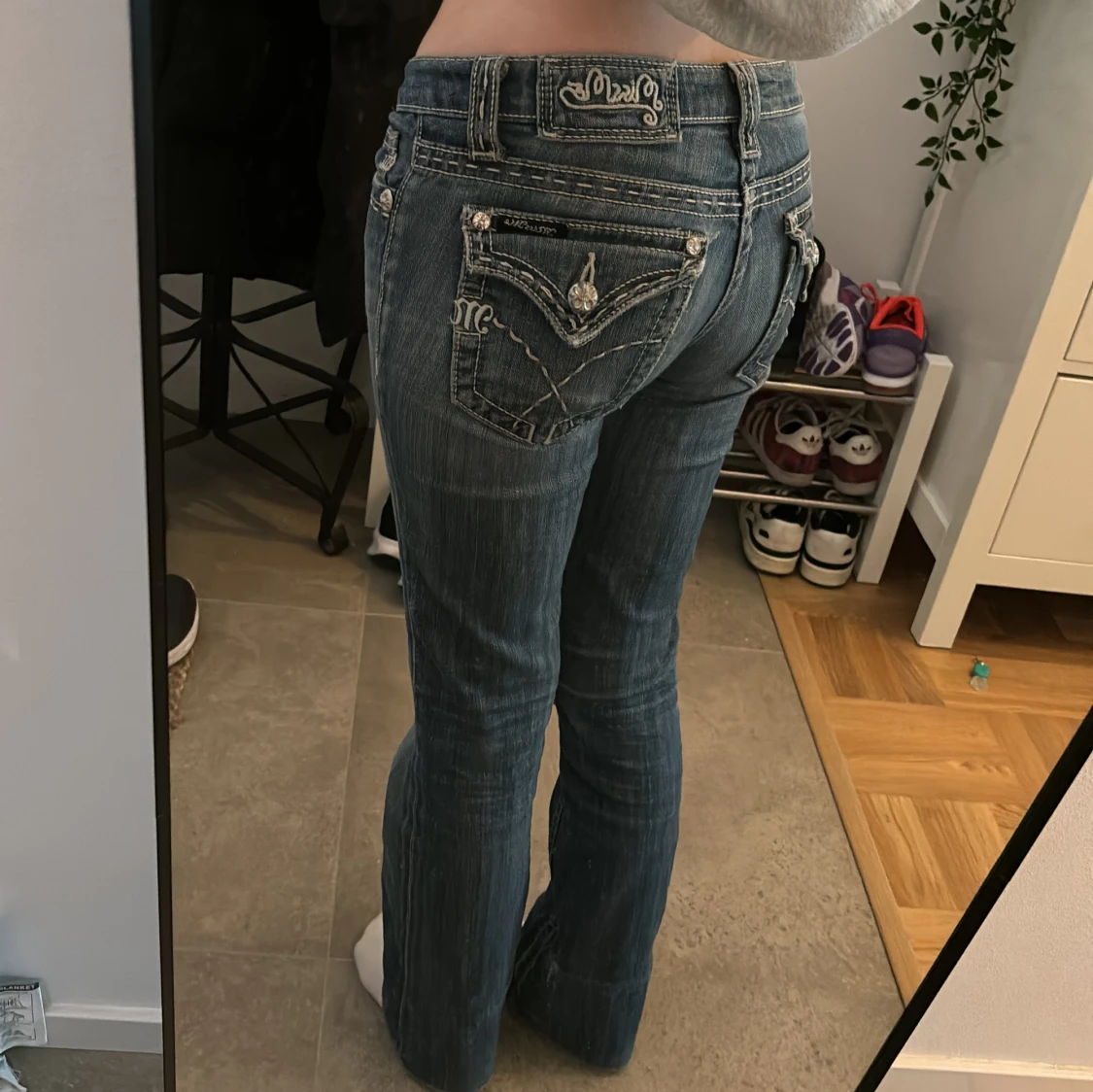 Säljer mina lågmidjade bootcut miss me jeans, super fina men kommer ej till användning. Har ett litet hål vid vänstra knät men det syns knappt.