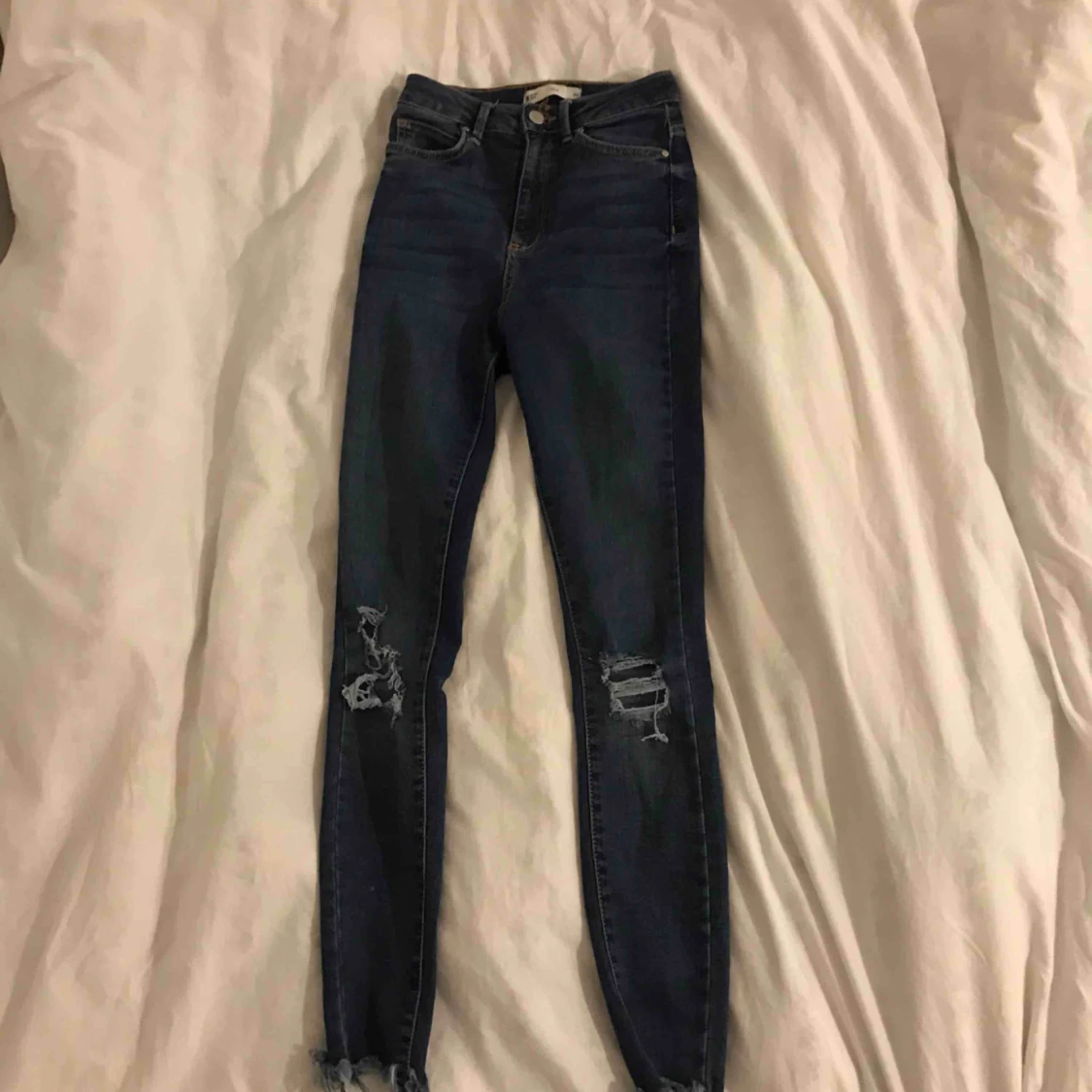 Ett par high waisted jeans men hål och fransar nedtill. Skulle säga att dessa byxor passar främst dom med långa ben. Säljer pga att dom inte kommer till användning hos mig. Kontakta vid intresse eller vill ha fler bilder 💘