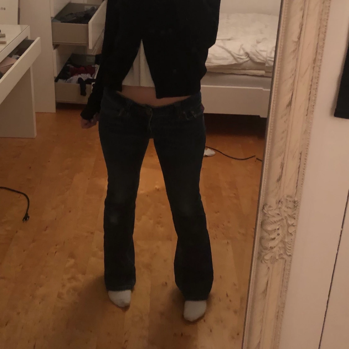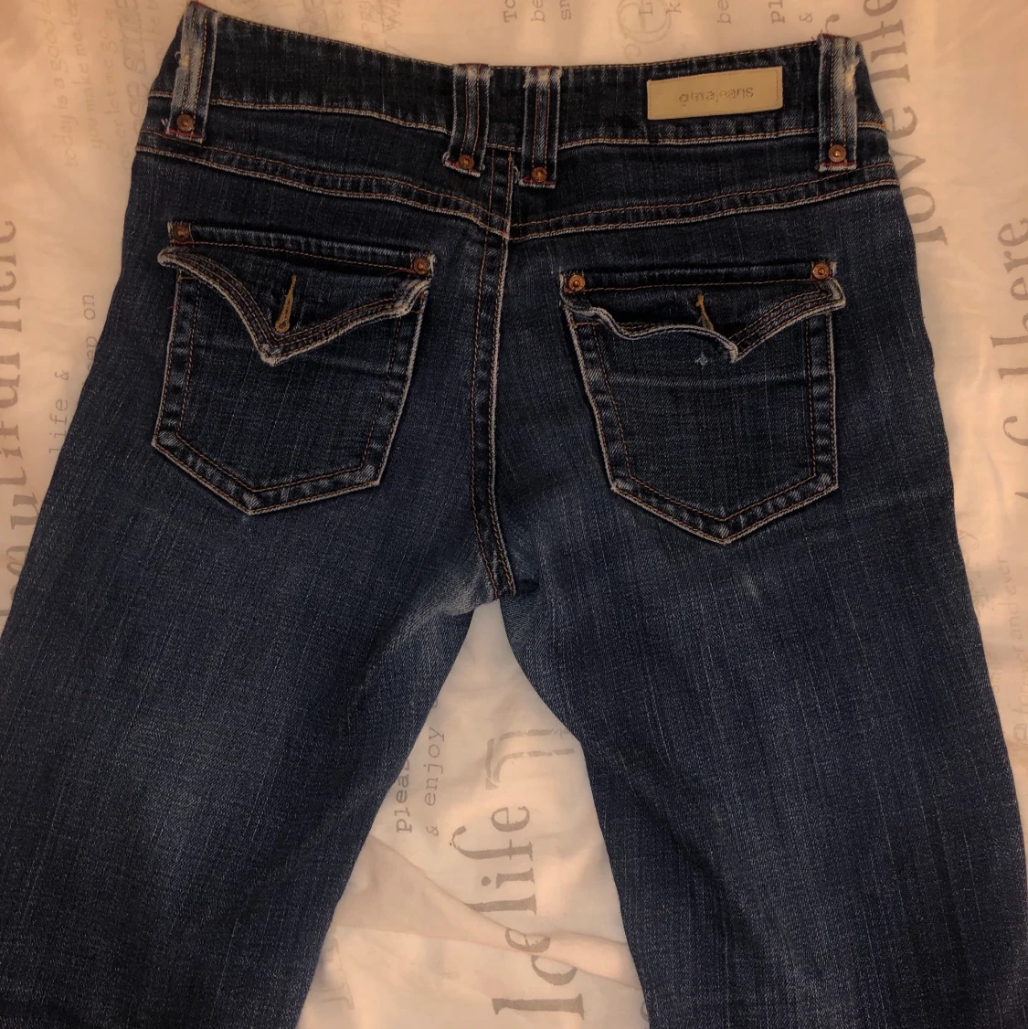 Snygga mörkblåa bootcut jeans från Gina tricot. Hör av dig för fler bilder! Är ca 168cm. (finns inga knappar på bakfickorna) Har likadana i ljusblåa 🌸