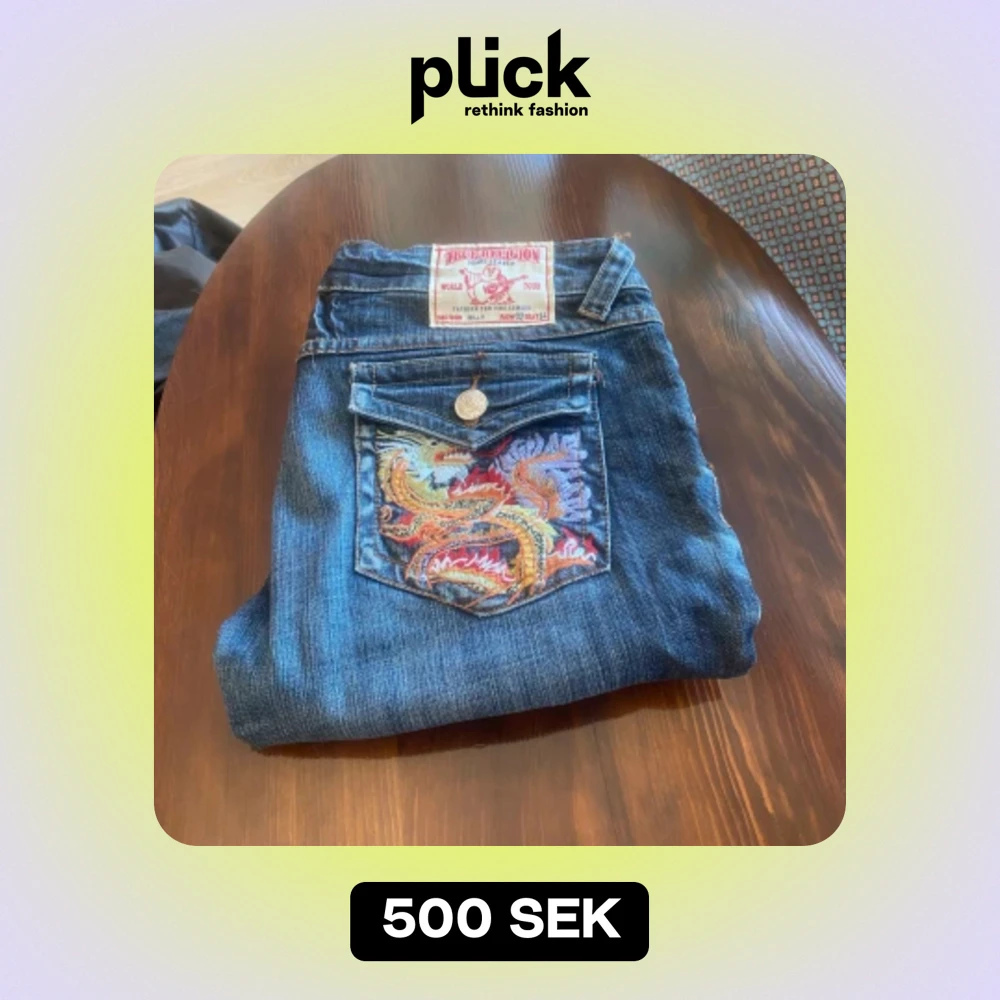 True religeon jeans i modellen Billy storlek 32, midjemått 39cm och benöppning 19cm jättefina med snyggt tryck på en av bakfickorna💖🙌 vädligt bra shick och köpta här på plick💞