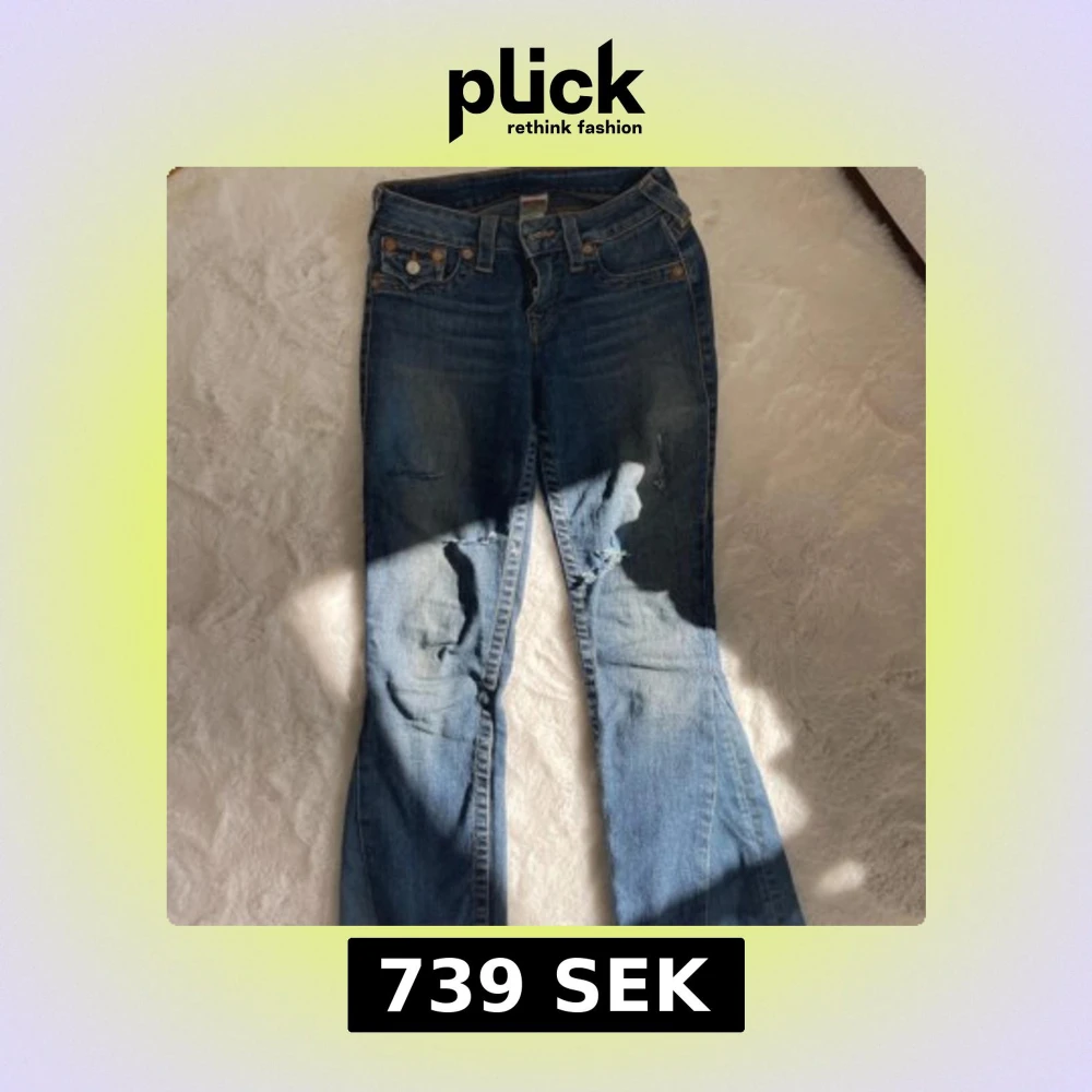 Priset går att diskutera! Säljer ett par klassiska blå jeans från True Religion med bootcut passform. Jeansen har slitna detaljer på benen, ikoniska bakfickor med broderi och silverfärgade knappar. Tillverkade i USA i mjukt denimtyg med snygga kontrastsömmar.