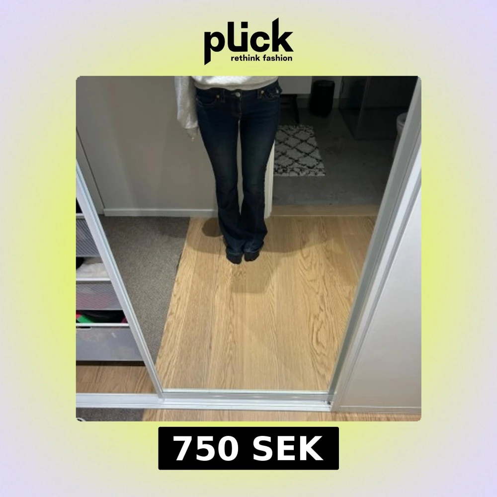 Snygga mörkblå jeans med bootcut passform från true religon. De är i storlek 27-32.
