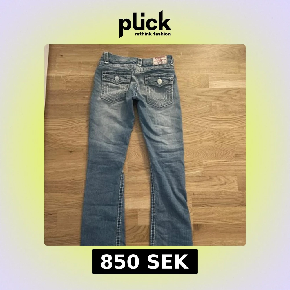 Snygga ljusblå lågmidjade jeans från True Religion med tydliga vita kontrastsömmar och klassiska bakfickor med knapp. Modellen har bootcut-ben. Säljer pga att dem inte kommer till användning💕.