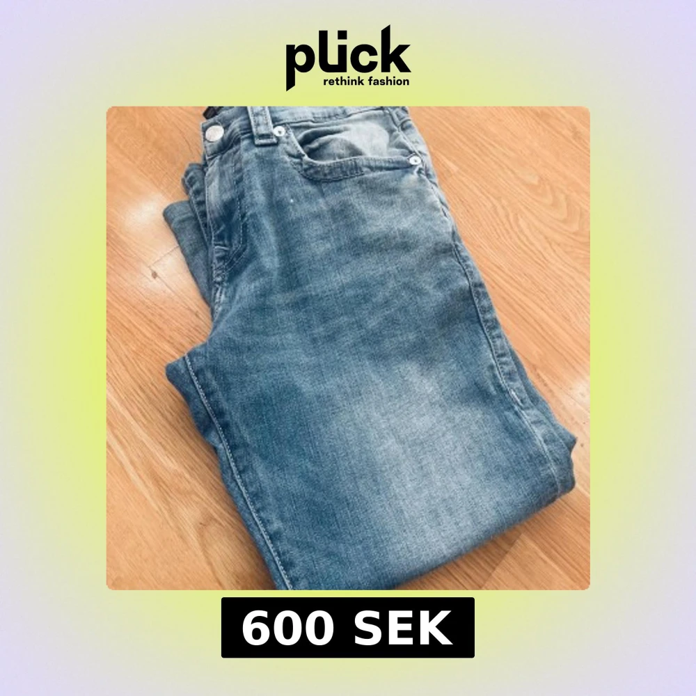 Säljer ett par ljusblå jeans från True Religion med klassisk logga bak och snygga kontrastsömmar. Jeansen har en unik bakficka med lock och knapp, samt raka ben. Perfekta för dig som gillar streetwear och vill sticka ut lite extra.