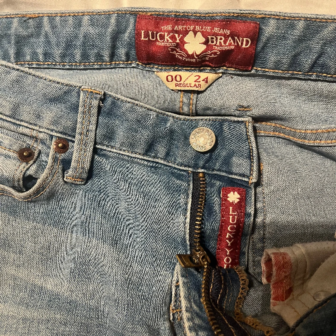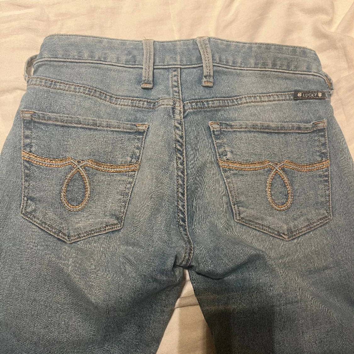 Lågmidjade jeans från märket ”LUCKY BRAND”. supersnygga men används tyvärr inte längre💕har själv sytt in dem i midjan så de passar mig med storlek 32-34 (Det går att spretta upp där jag sytt in midjan så de blir som ”vanligt” igen)❤️🔥