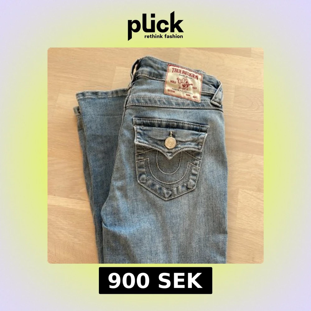 Säljer ett par ljusblå jeans från True Religion med snygga kontrastsömmar och ikonisk bakficka med lock och silverfärgad knapp. Klassisk femficksmodell i mjuk bomullsdenim, perfekt för dig som gillar street och premiumkänsla.