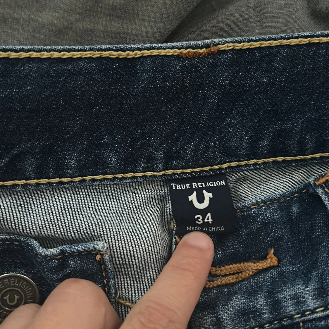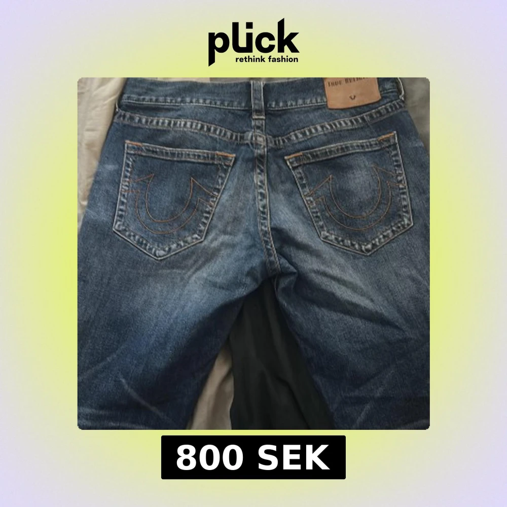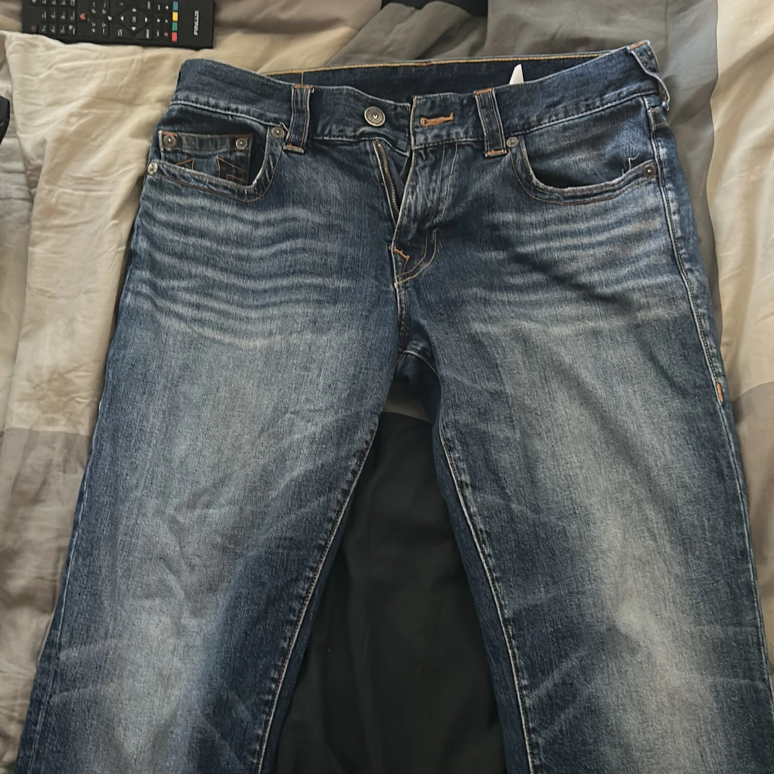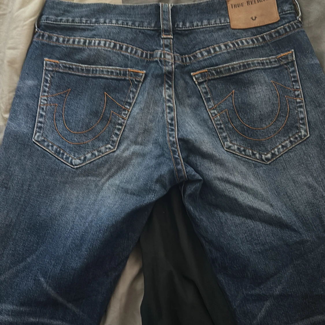 Säljer ett par klassiska blå jeans från True Religion i storlek 34. Jeansen har tydliga kontrastsömmar, ikoniska bakfickor med broderad logga och snygg tvättad finish. Tillverkade i slitstarkt denim med fem fickor och knappgylf.