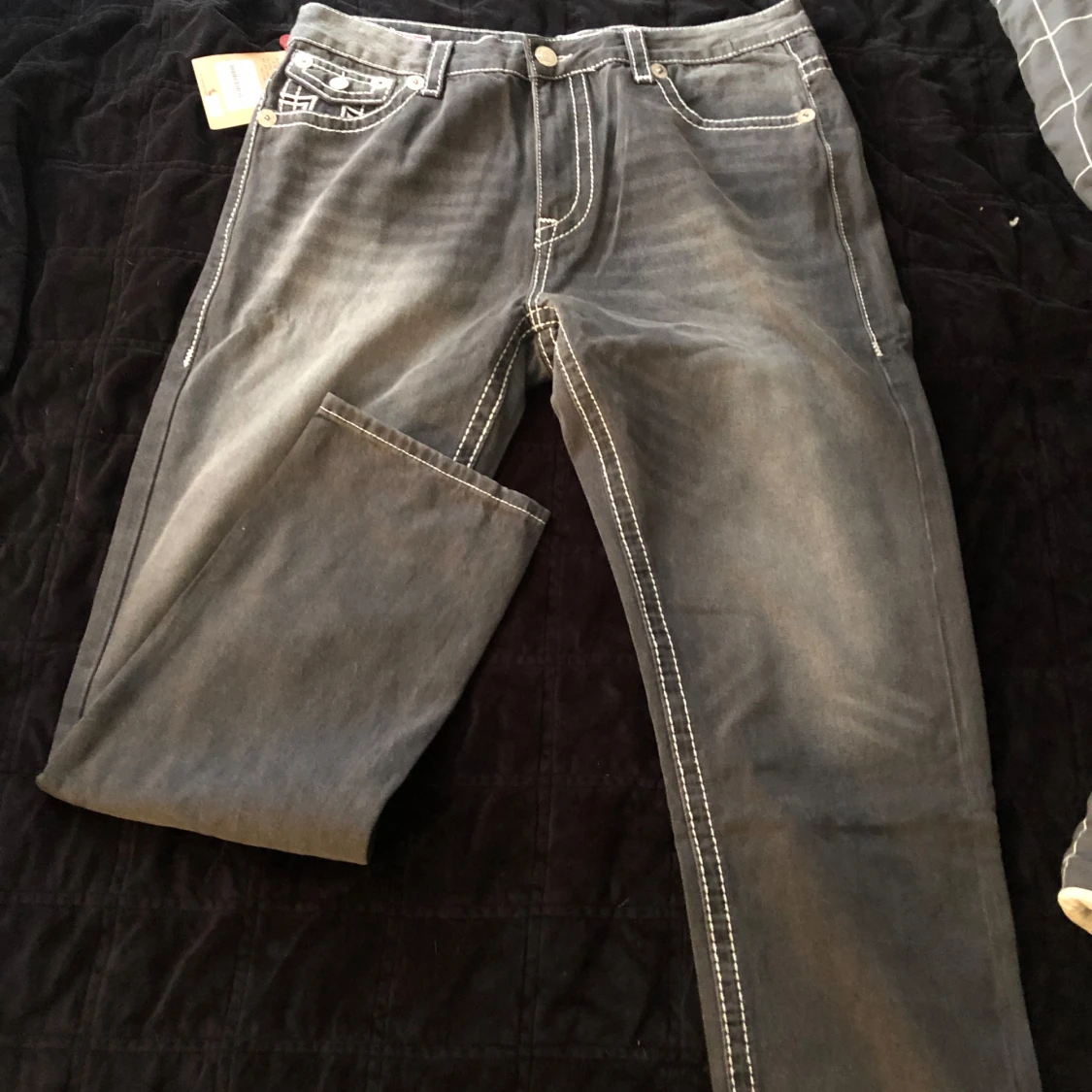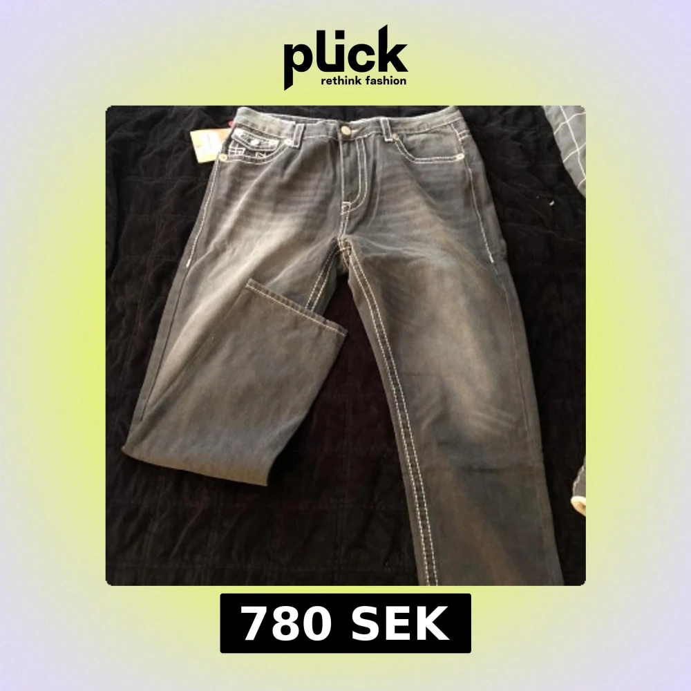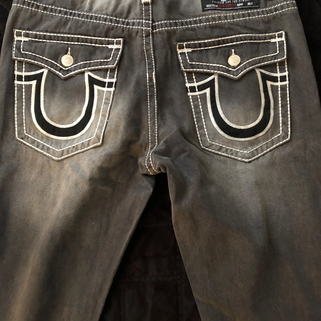 Säljer ett par svarta jeans från True Religion med tydliga vita kontrastsömmar och ikoniska bakfickor med broderad logga. Jeansen har klassisk femficksdesign och raka ben. Perfekta för dig som vill sticka ut med detaljer.