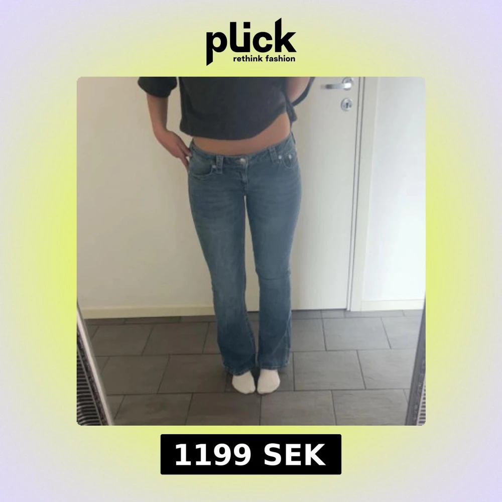 Säljer ett par klassiska blå jeans från True Religion med bootcut passform. Jeansen har hög midja, fem fickor och ikonisk broderad bakficka. Perfekta för dig som gillar en tidlös denimlook. Använda 1 gång, ny pris 1399