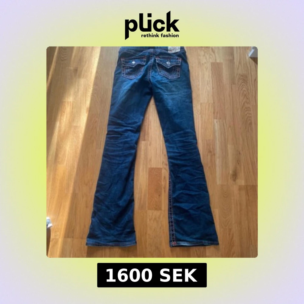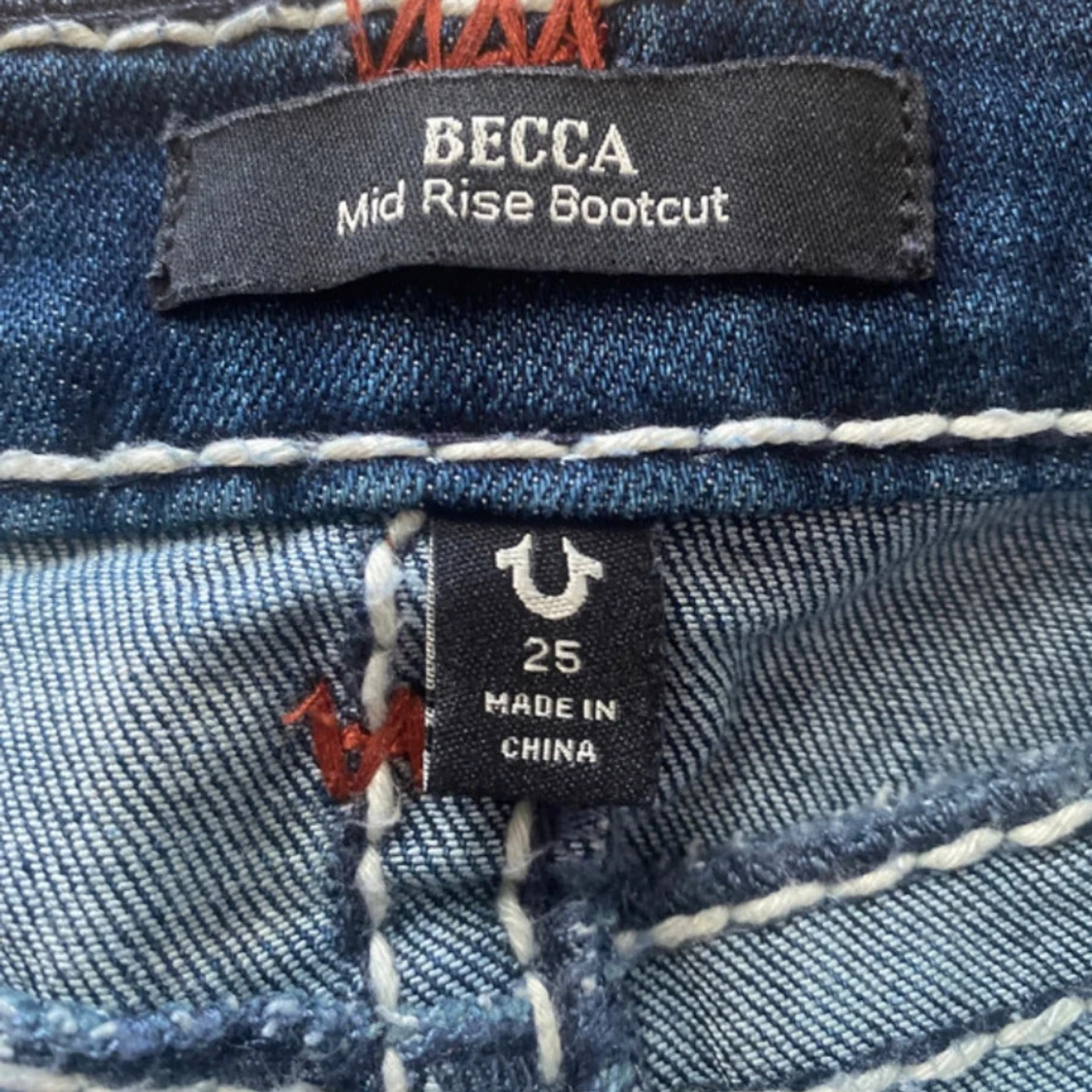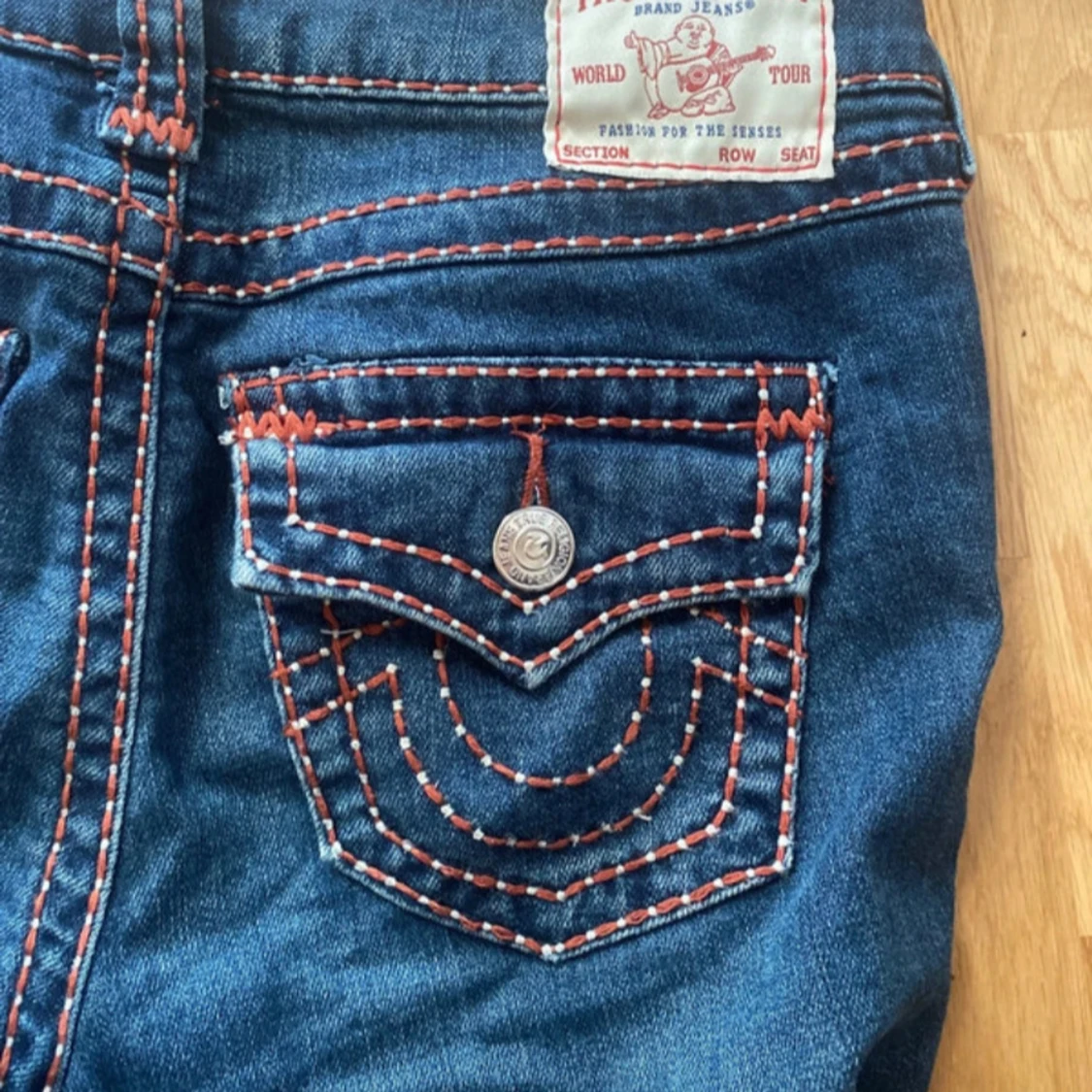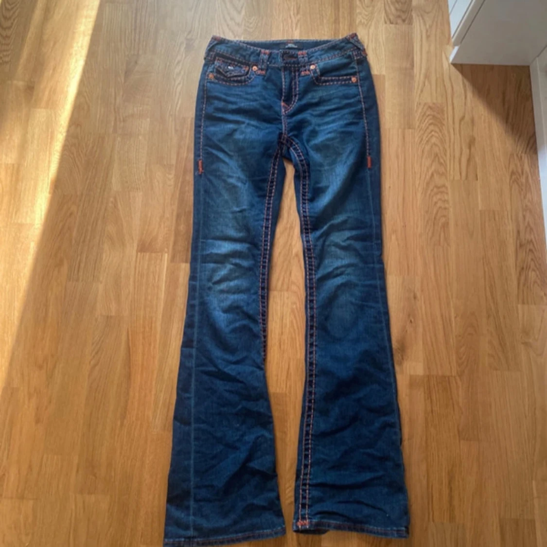 Snygga blå jeans från True Religion, modell Becca Mid Rise Bootcut. Jeansen har vinröda kontrastsömmar. Bootcut passform och midwaist men är som low waist! Perfekt för dig som gillar detaljer och lite annorlunda jeans än de vanliga true religion. Använda typ 7 gånger och nypris 2399kr. Tror inte jeansen säljs längre då jag inte hittat de någonstans!