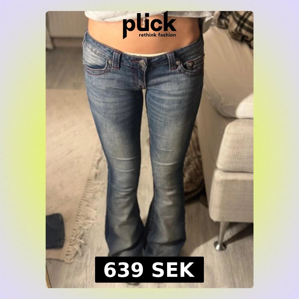 Snygga blå jeans från True Religion med bootcut passform och låg midja. Jeansen har röda kontrastsömmar, klassiska fickor och dekorativa detaljer på bakfickorna. Tillverkade i stretchigt denim för skön passform.