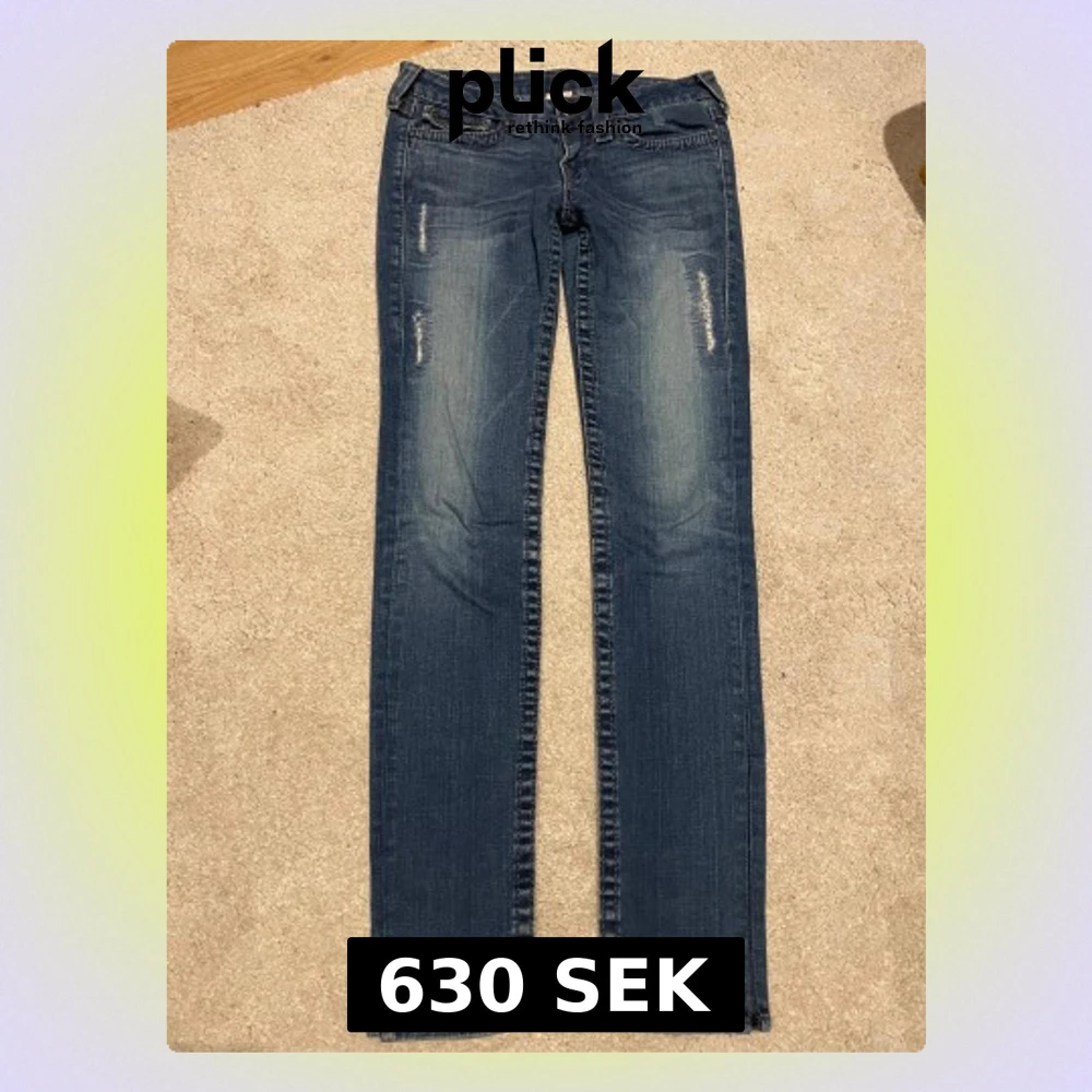 Snygga blå jeans från True Religion med slitna detaljer framtill. Klassiska bakfickor med dekorativa sömmar och knappar. Började sy om jeansen så det är som en slits går enkelt att sy tillbaka eller sy om. Perfekt för dig som gillar en avslappnad men trendig look.