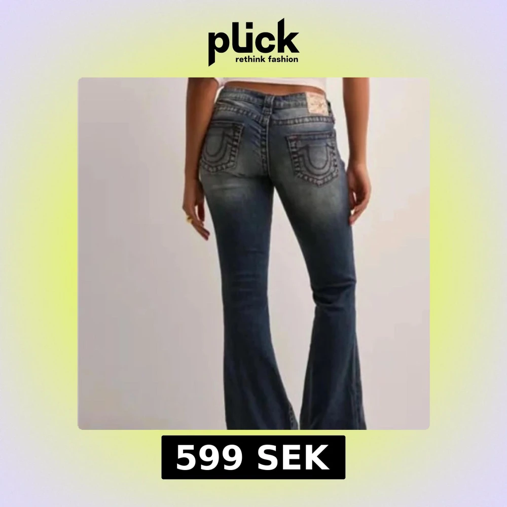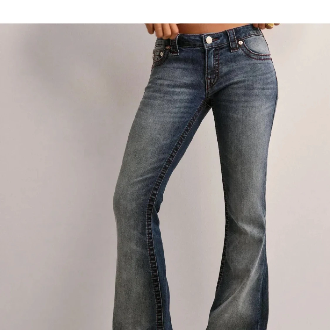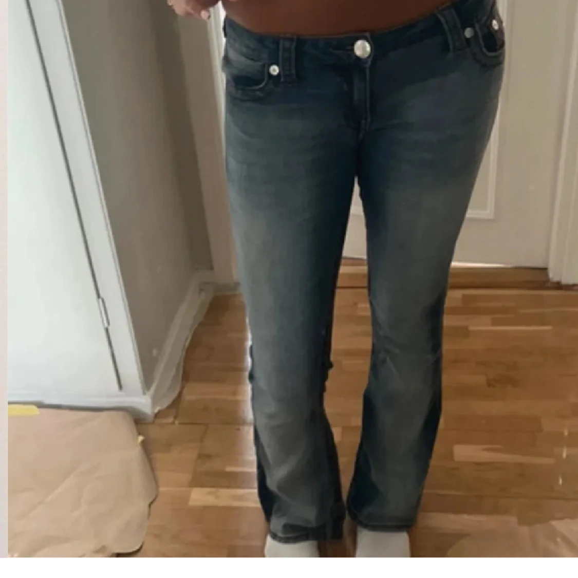Säljer ett par blå low waist jeans från True Religion med bootcut passform. Jeansen har röda kontrastsömmar, klassiska bakfickor med broderad logga och silverfärgade knappar. Dom är sydda vid midjan men det går att sprätta bort. Storlek 28 vilket ungefär motsvaras storlek S/36. Nya pris är 1 299