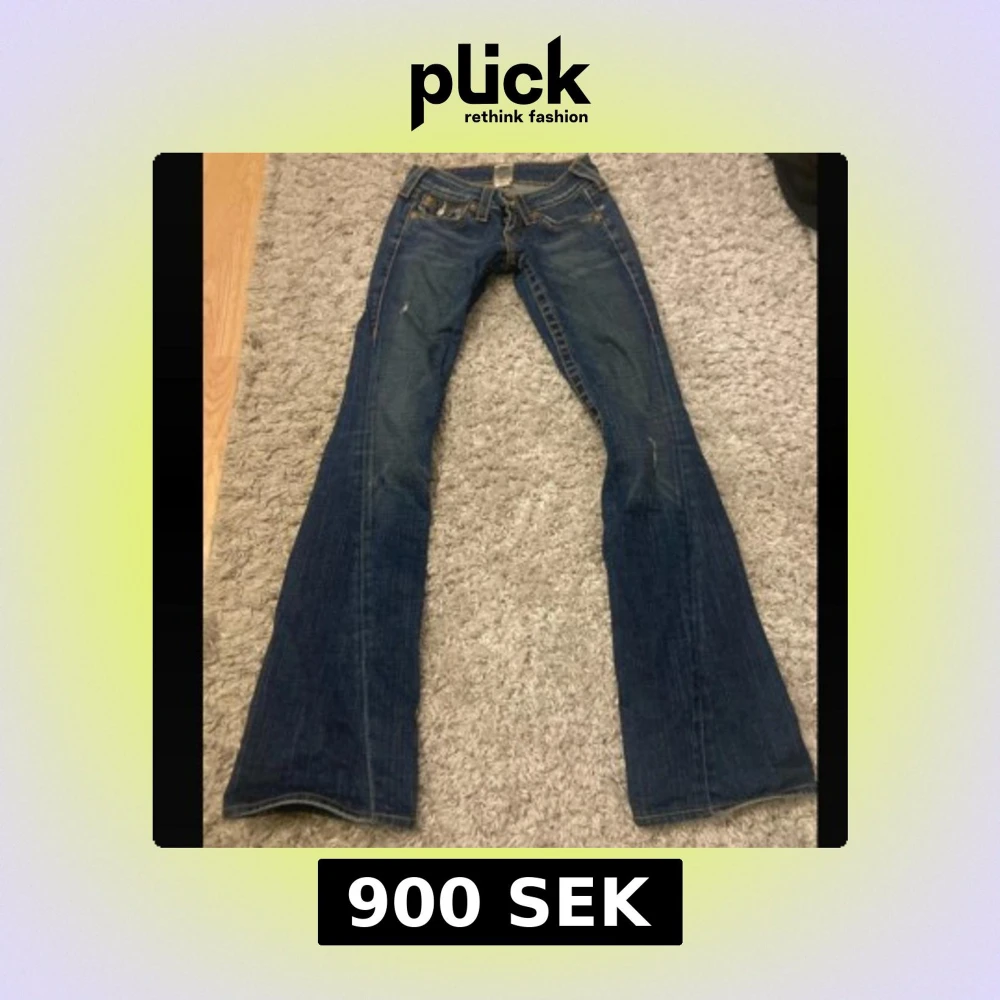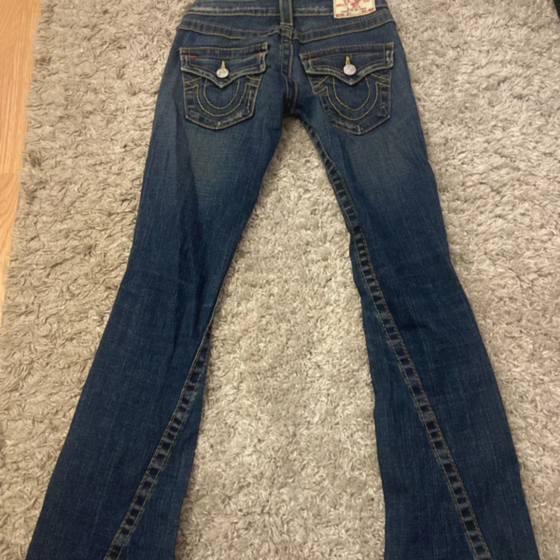 Säljer ett par klassiska blå bootcut jeans från True Religion i storlek 24. Jeansen har snygga kontrastsömmar, detaljerade bakfickor med knappar och låg midja. Perfekta för dig som gillar en tidlös denimlook med lite extra attityd.