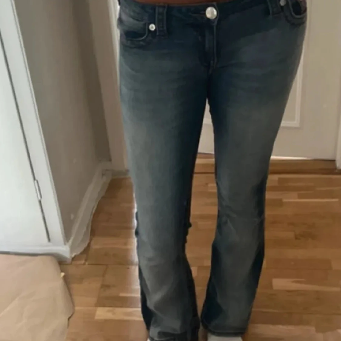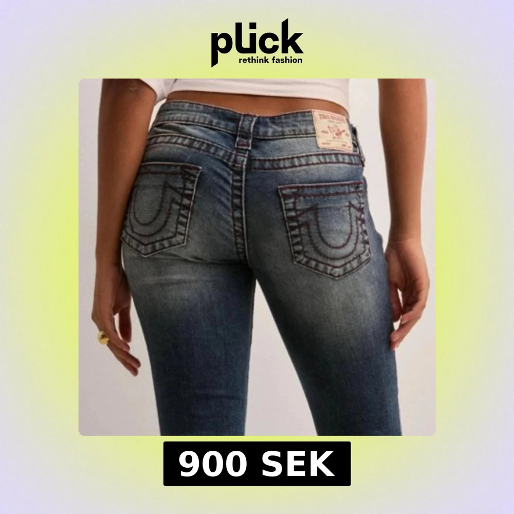 Säljer ett par blå low waist jeans från True Religion med bootcut passform. Jeansen har röda kontrastsömmar. Dom är sydda vid midjan men det går att sprätta bort. Skriv om ni vill att jag ska ta bort det jag har sytt runt midjan!!! Storlek 28 vilket ungefär motsvaras storlek S/36. Nya pris är 1 299