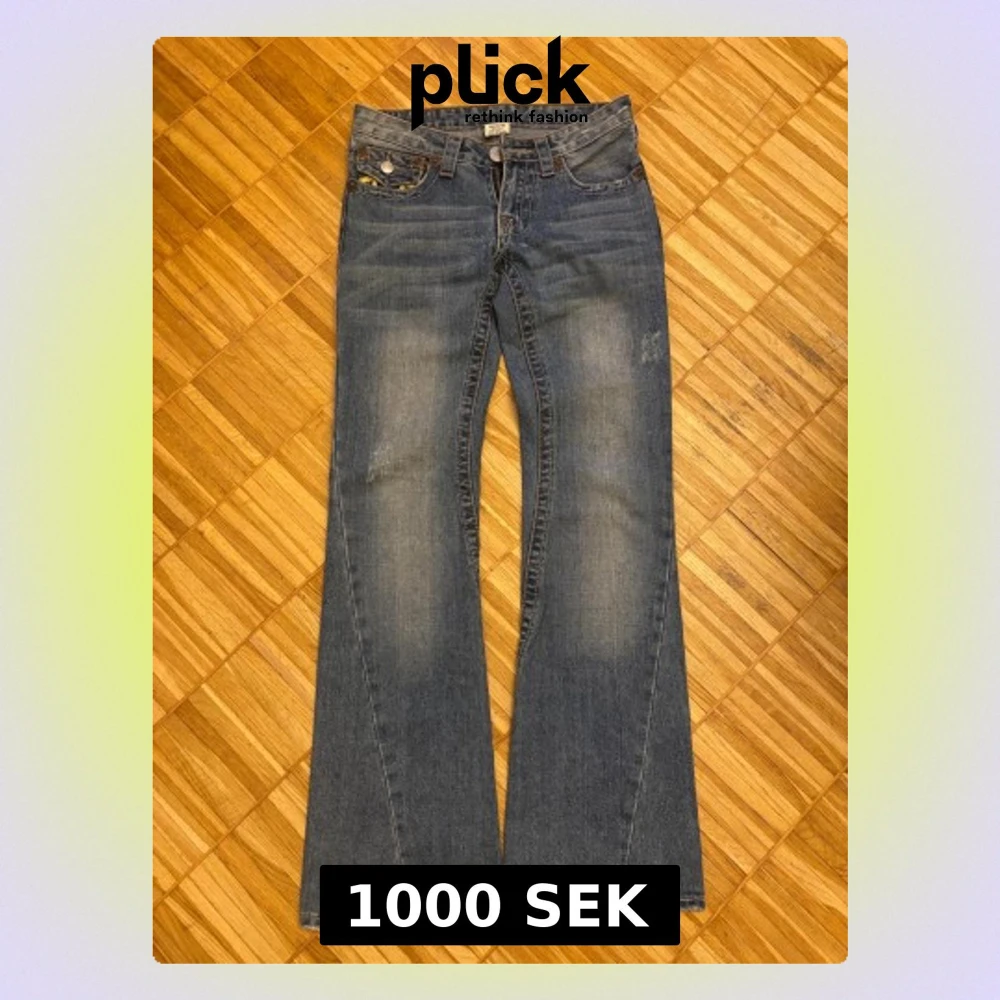 Säljer ett par klassiska blå jeans från True Religion med bootcut passform och snygga gula kontrastsömmar på bakfickorna. Jeansen är tillverkade i 100% bomull och har låg midja samt detaljerade fickor med knappar. Perfekt för dig som gillar ikoniska denim-vibes.