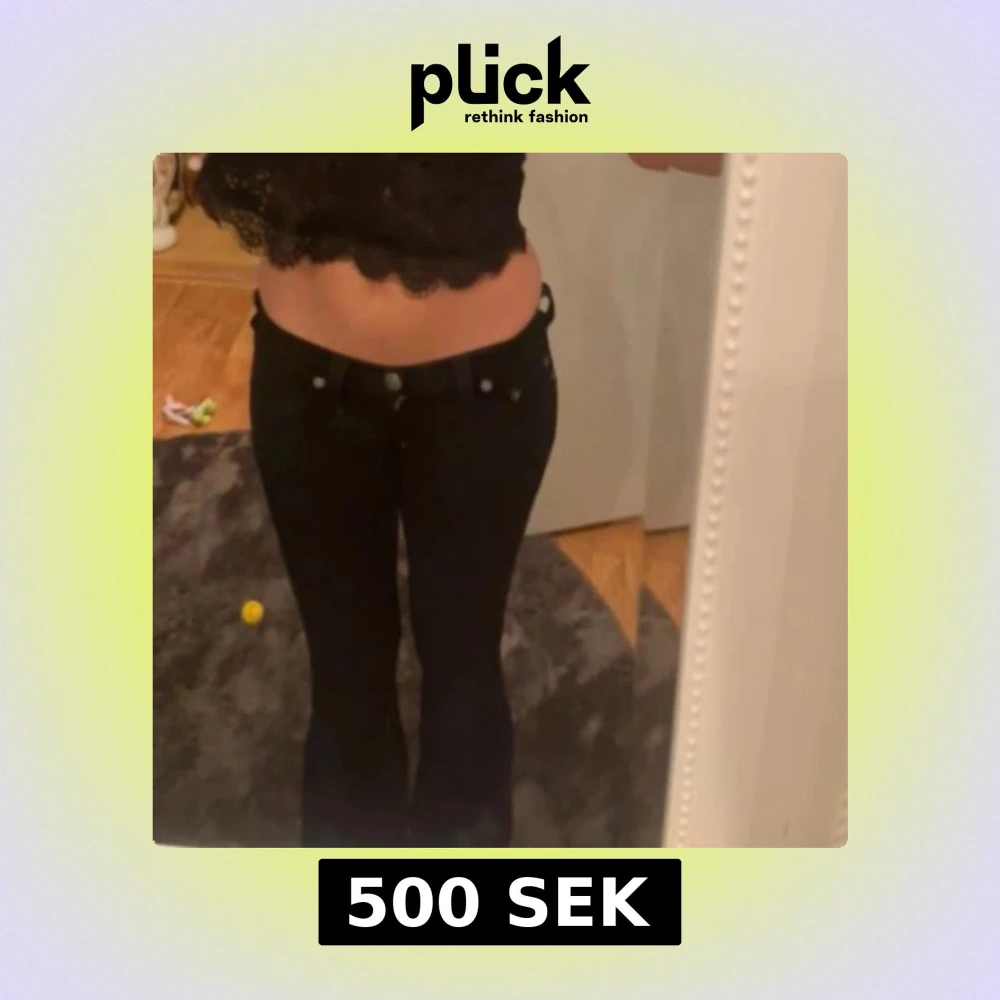 Omsydda vintage true religion jeans till bootcut och lågmidja, köpta här på plick men de var tyvärr för små för mig. Storlek 24, vilket motsvarar XS. Har en fläck på ena benet som jag inte vet om de går bort eller ej. Annars jätte snygga!