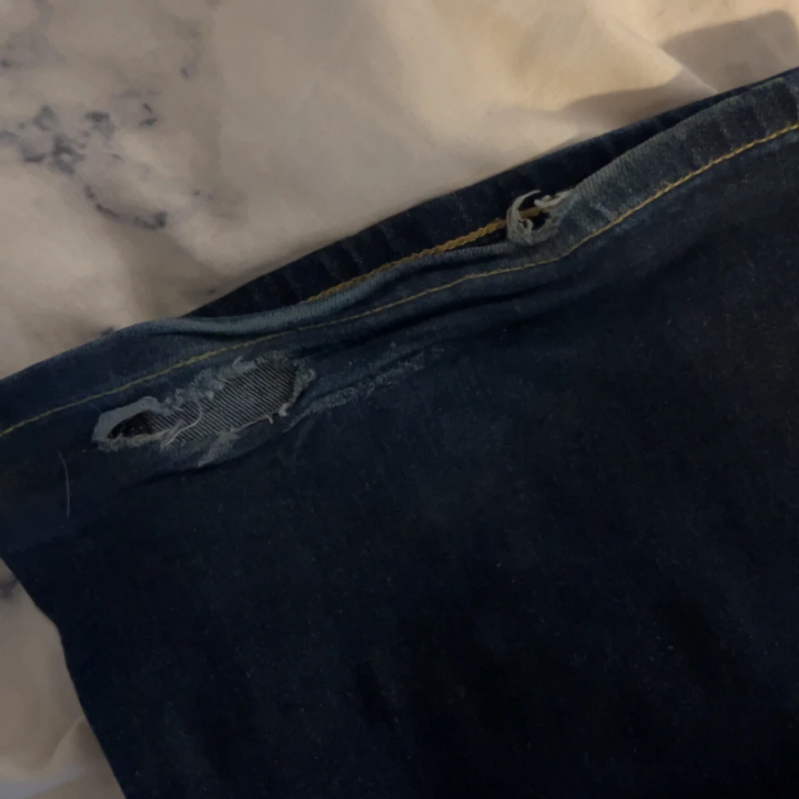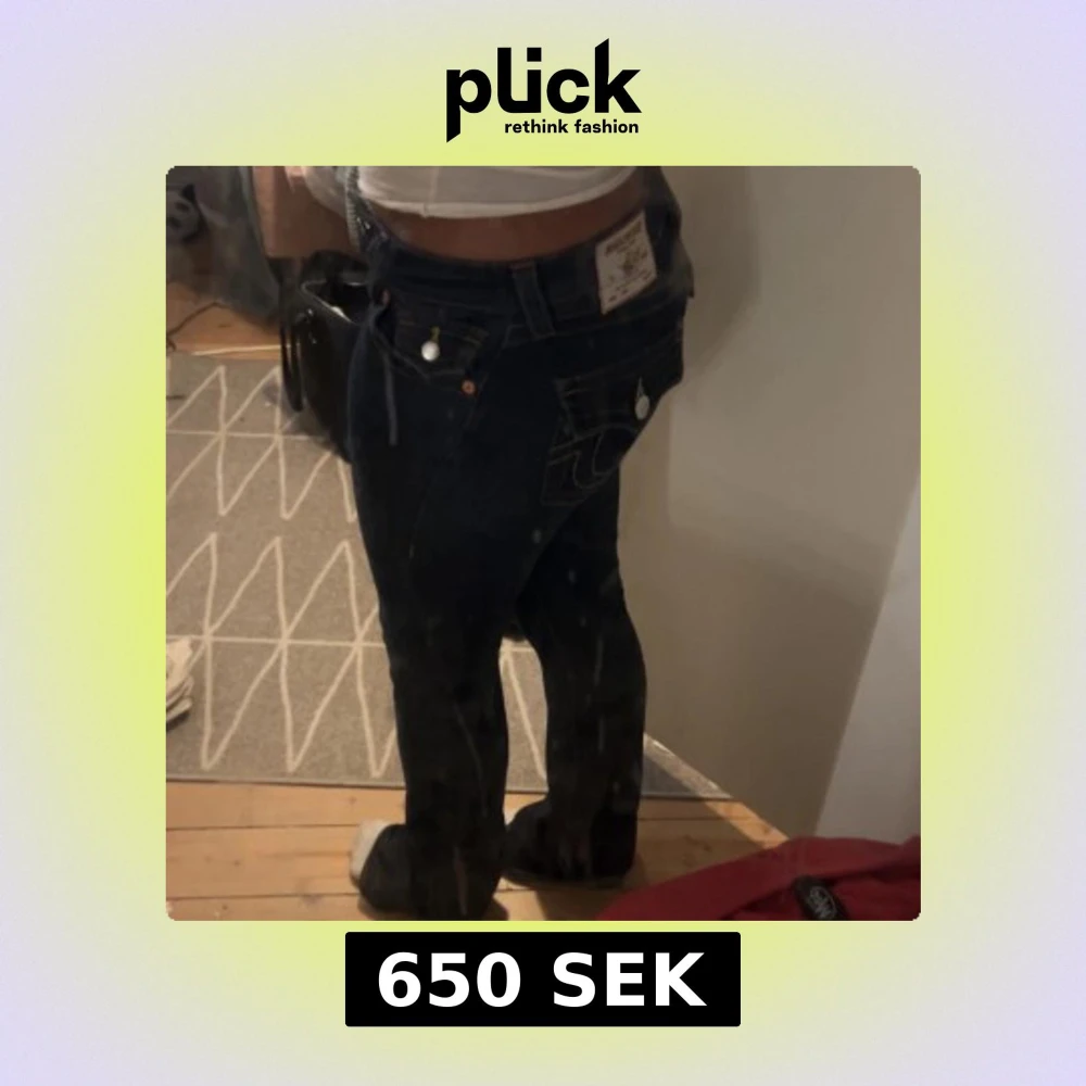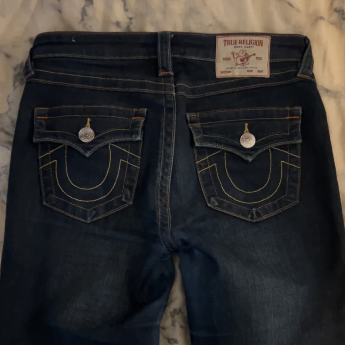 Säljer ett par mörkblåa true religion jeans i storlek 26, passar för nån i storlek XS/S säljer pga ingen användning. Dem har en liten defekt nere vid fötterna men annars är dem i bra skick! 💗