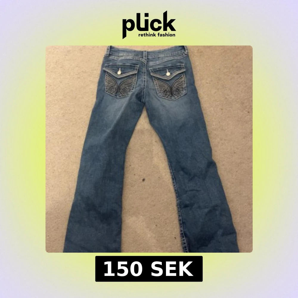 Snygga blå jeans med unika broderade detaljer på bakfickorna. De har en klassisk femficksdesign och en knappgylf. Köpt på Ginatricot med inga defekter på💕