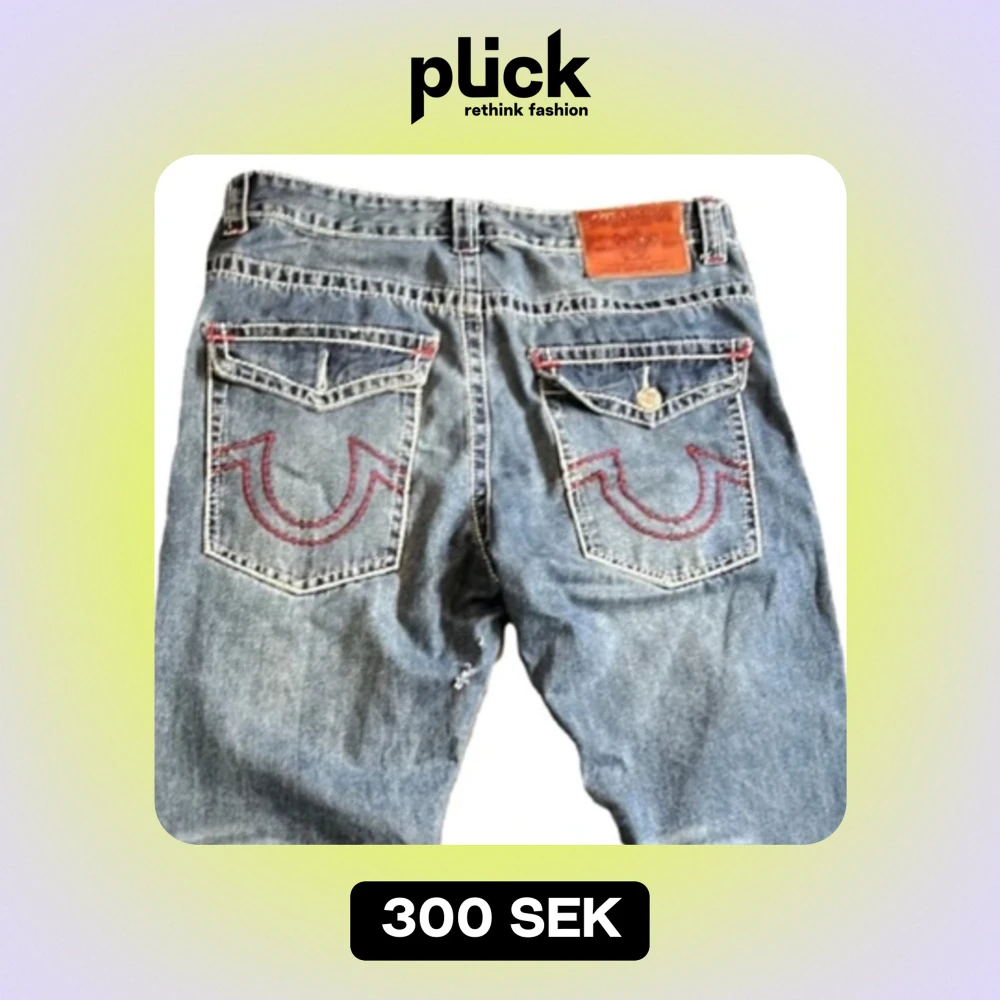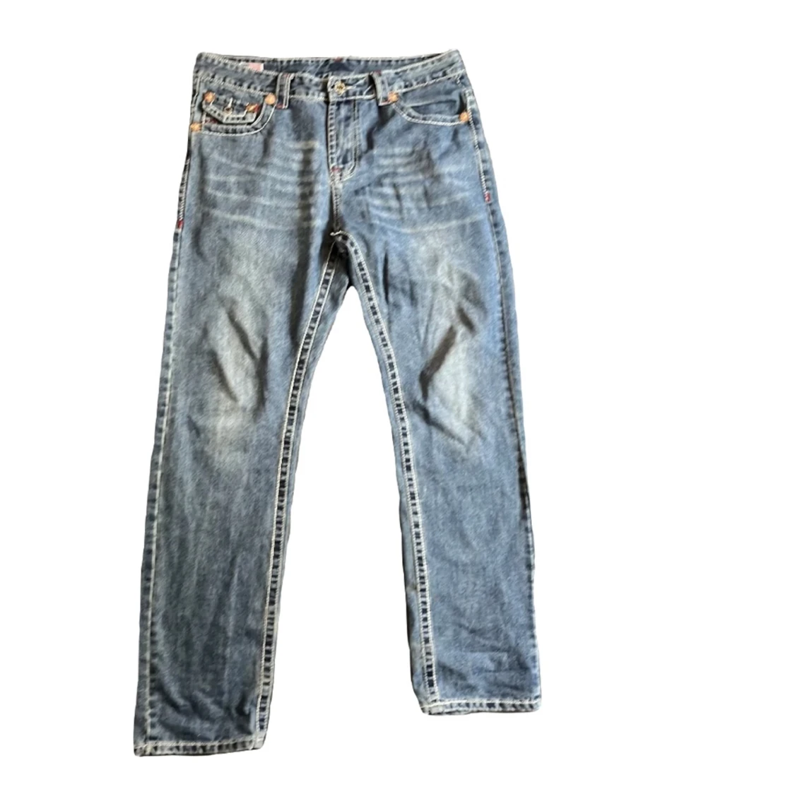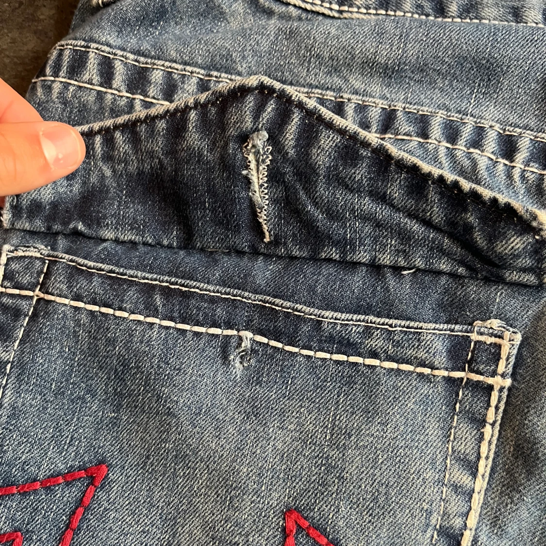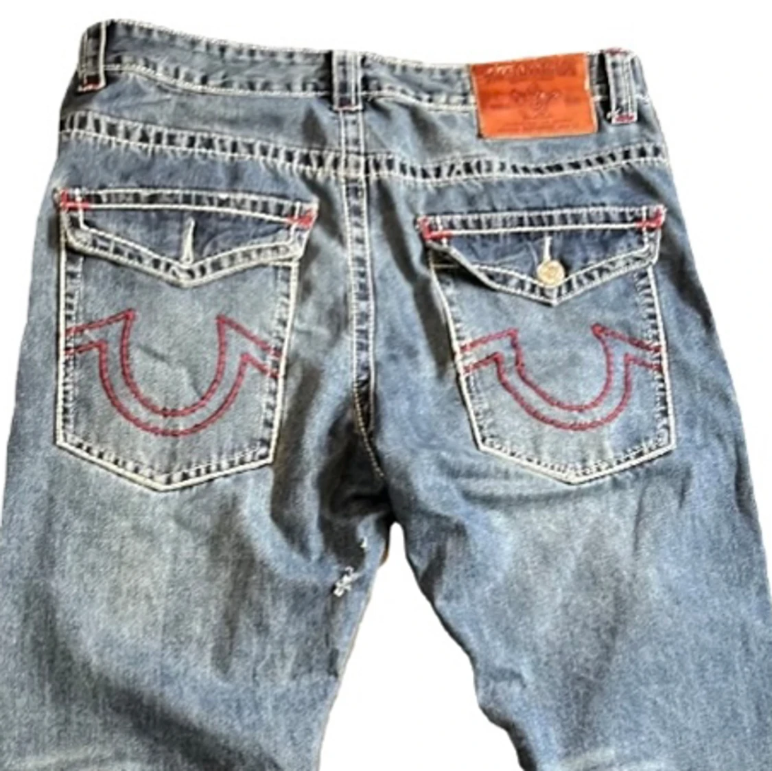 Blå true religion jeans med röda detaljer i bra skick. Mått: ytterbenlängd 112cm, midjelångd 48cm, innerbenlängd 82cm. Defect: Vänsterbakficka saknar knapp. Litet hål på vänster innersida byxben.