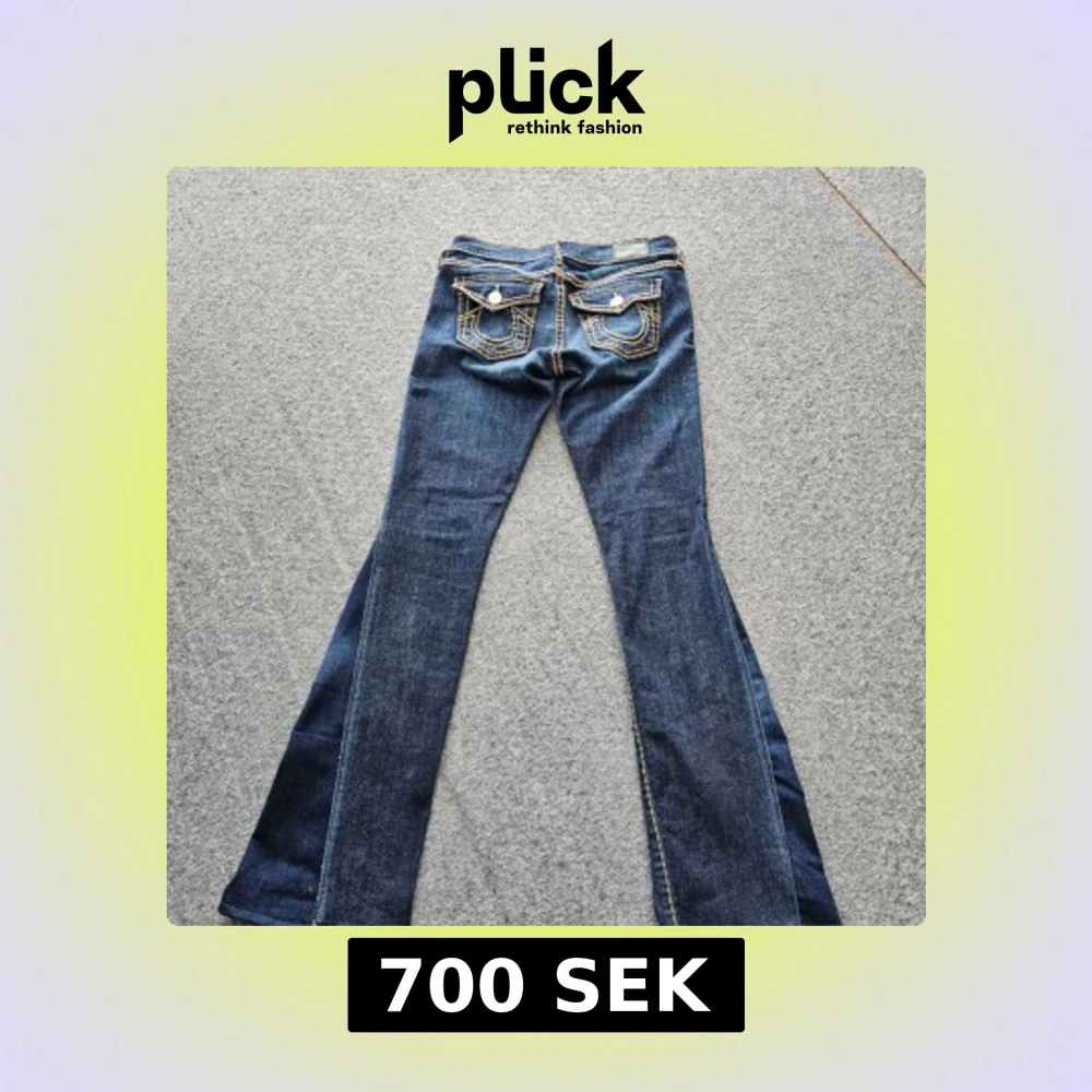 Säljer ett par mörkblå bootcut jeans från True Religion med snygga kontrastsömmar och ikoniska fickdetaljer bak. Jeansen har låg midja och klassisk femficksdesign. Materialet är jeans med en skön stretch och de är bootcut utsvängda ben. Storlek XS-S, sytt ut dem till bootcut men skicket är som helt nya jeans och aldrig använda!!