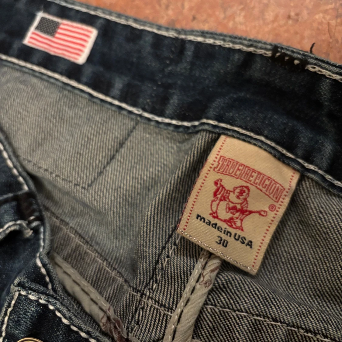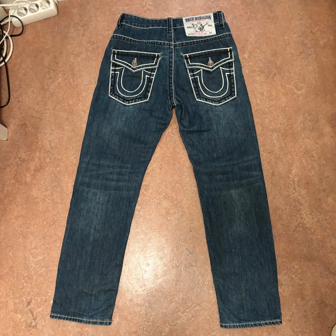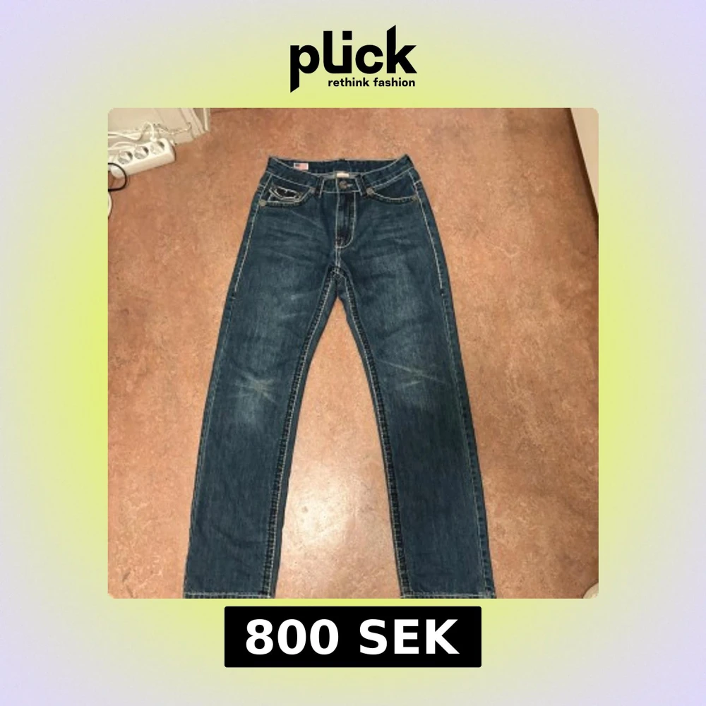 säljer ett par blå True Religion jeans med ikoniska kontrastsömmar och stora bakfickor med lock och tryckknappar.Klassisk femficksmodell, tillverkad i USA av bomull Snygg tvätt och detaljer som sticker ut. De är även knappt använda och ett nytt par skulle kosta 2000-2500 så det är ett bra pris jag har satt men du kan även pruta