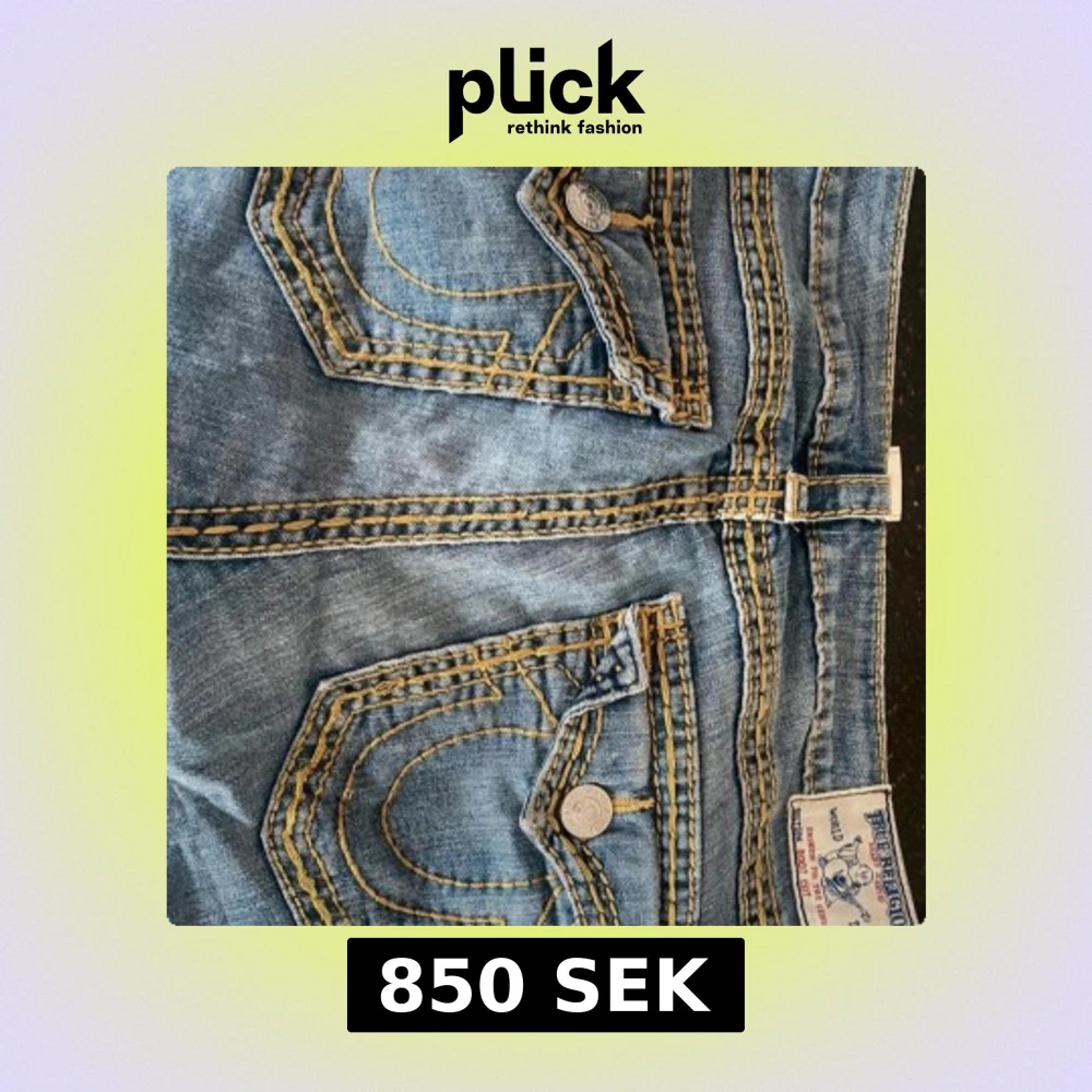 Säljer ett par blå jeans med tydliga kontrastsömmar och unika fickdetaljer. Jeansen har en bootcut-stil och är perfekta för en avslappnad look. De har en klassisk design med knappar och dragkedja framtill.