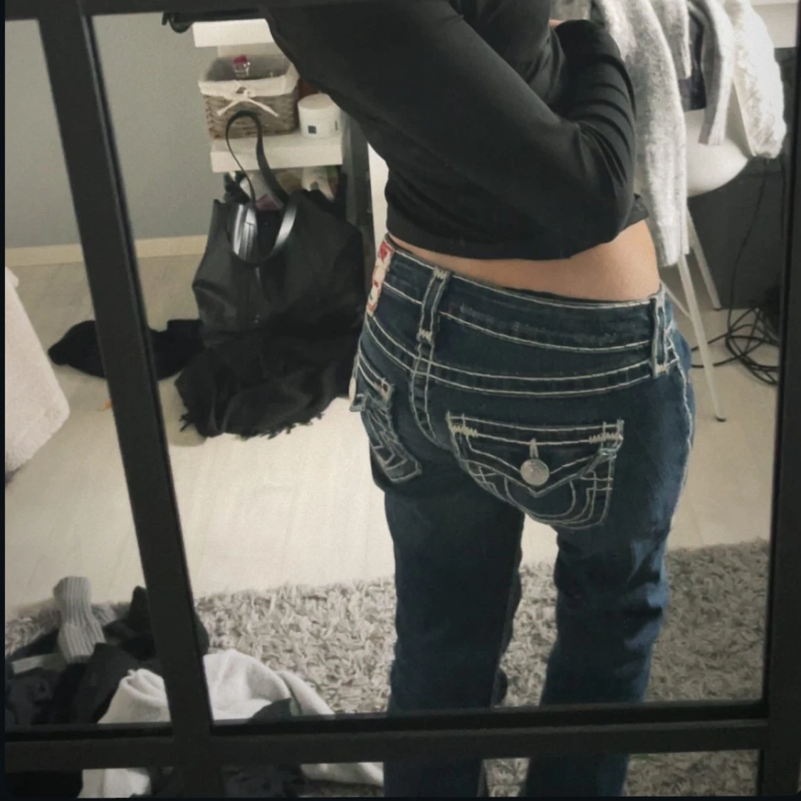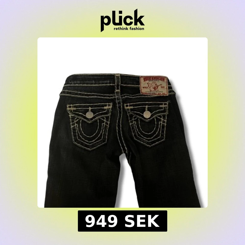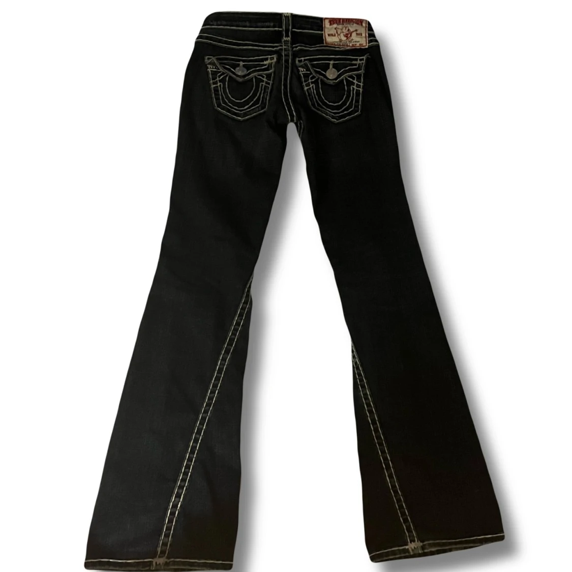 Snygga True religion jeans med kontrastsömmar. Jeansen är bootcut och lågmidjade. Inga defekter. [Midjemått: 34cm] [Innerbenslängd: 84cm] Kontakta mig ifall du har några funderingar! Köpta för 1100kr och har använts fåtal gånger❤️
