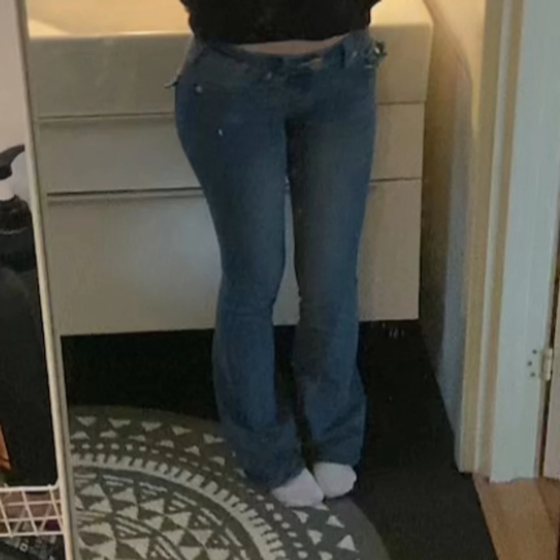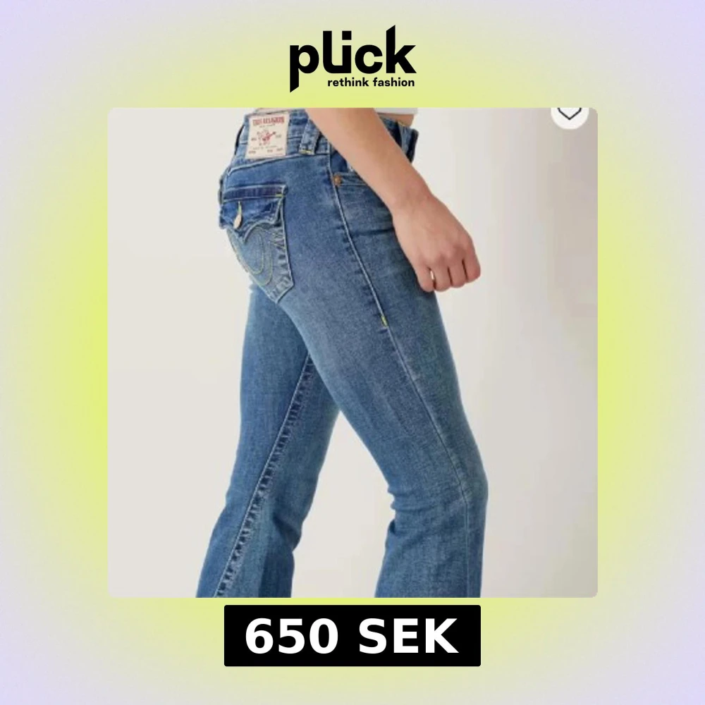 Säljer ett par blå jeans från True Religion med bootcut-modell. Jeansen har klassiska kontrastsömmar, snygga fickdetaljer med knappar och logopatch bak. En knapp har låsbat där bak men inget man tänker på, därav priset. Något slita längst ner.