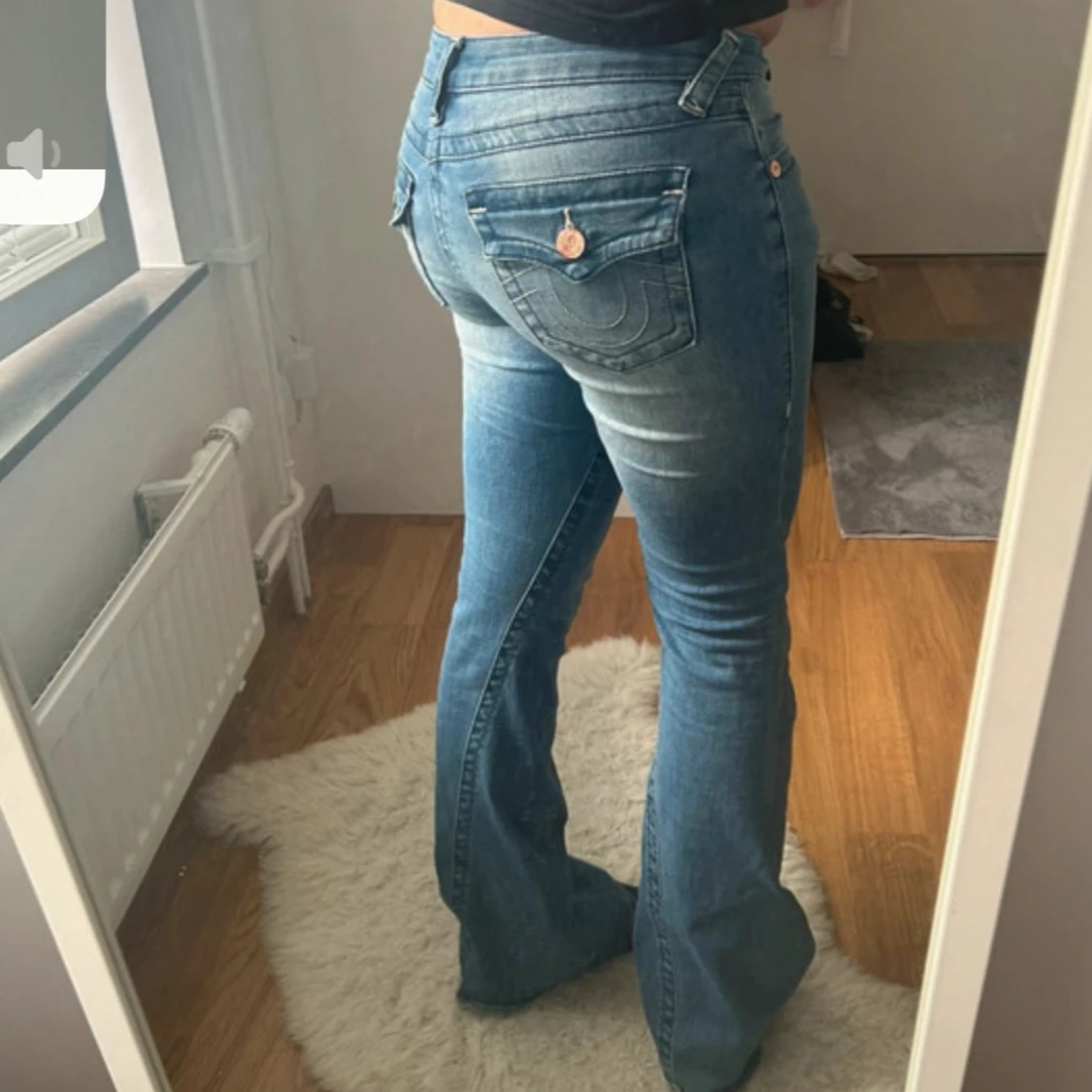 Snygga blå jeans från True Religion med bootcut passform, passar mig som har storlek 36 och är ca 170.