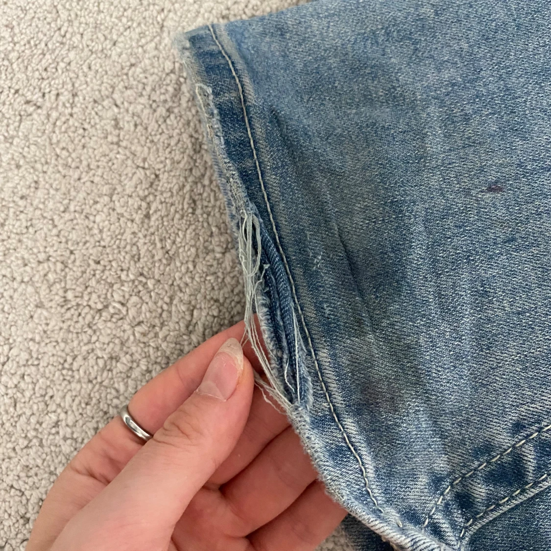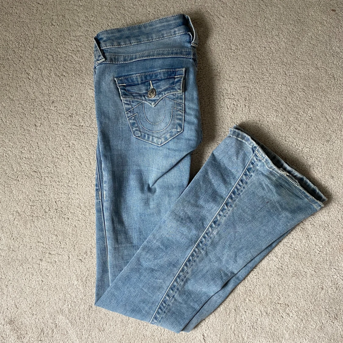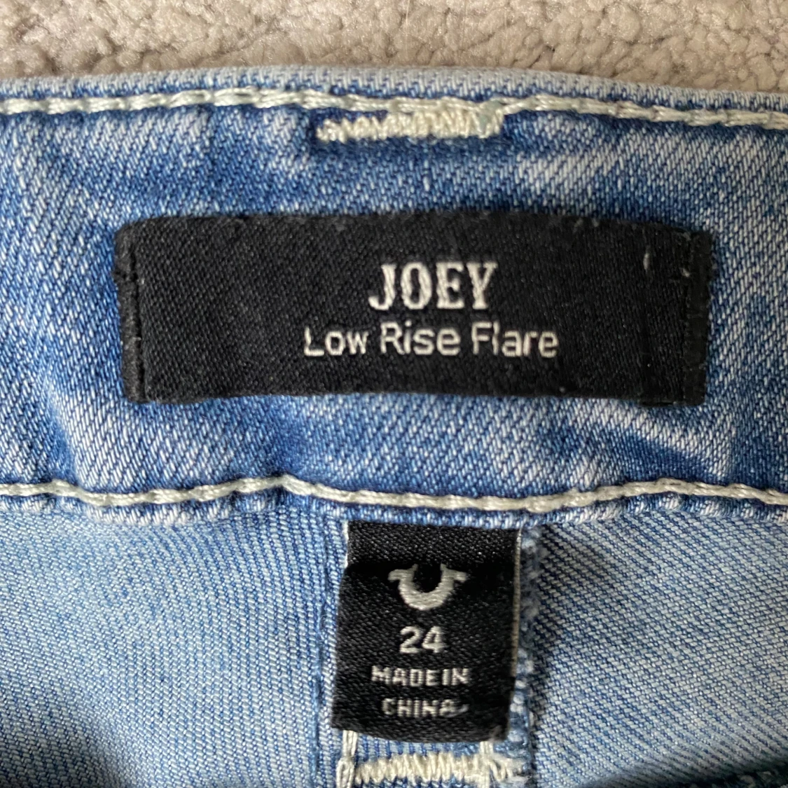 Snygga ljusblå jeans från True Religion, modell Joey Low Rise Flare. Bilderna är tagna innan de tvättas så de kommer inte vara smutsiga vid foten. Storlek: 24 och de har inte så mycket tecken på användning bortom benen. Hör av er vid frågor och funderingar!🥰
