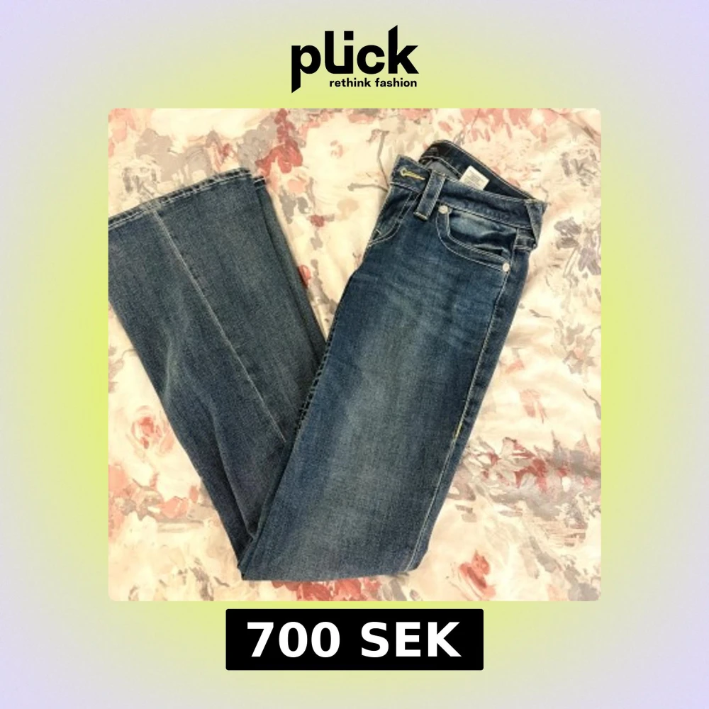 Snygga blå jeans från True Religion, modell Joey Low Rise Flare. De har låg midja, utsvängda ben och klassiska kontrastsömmar. Bakfickorna har dekorativa sömmar och knappstängning. finns även på vinted