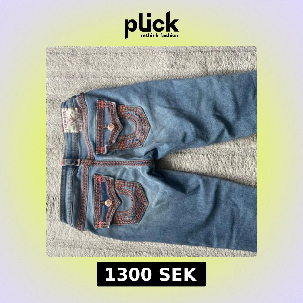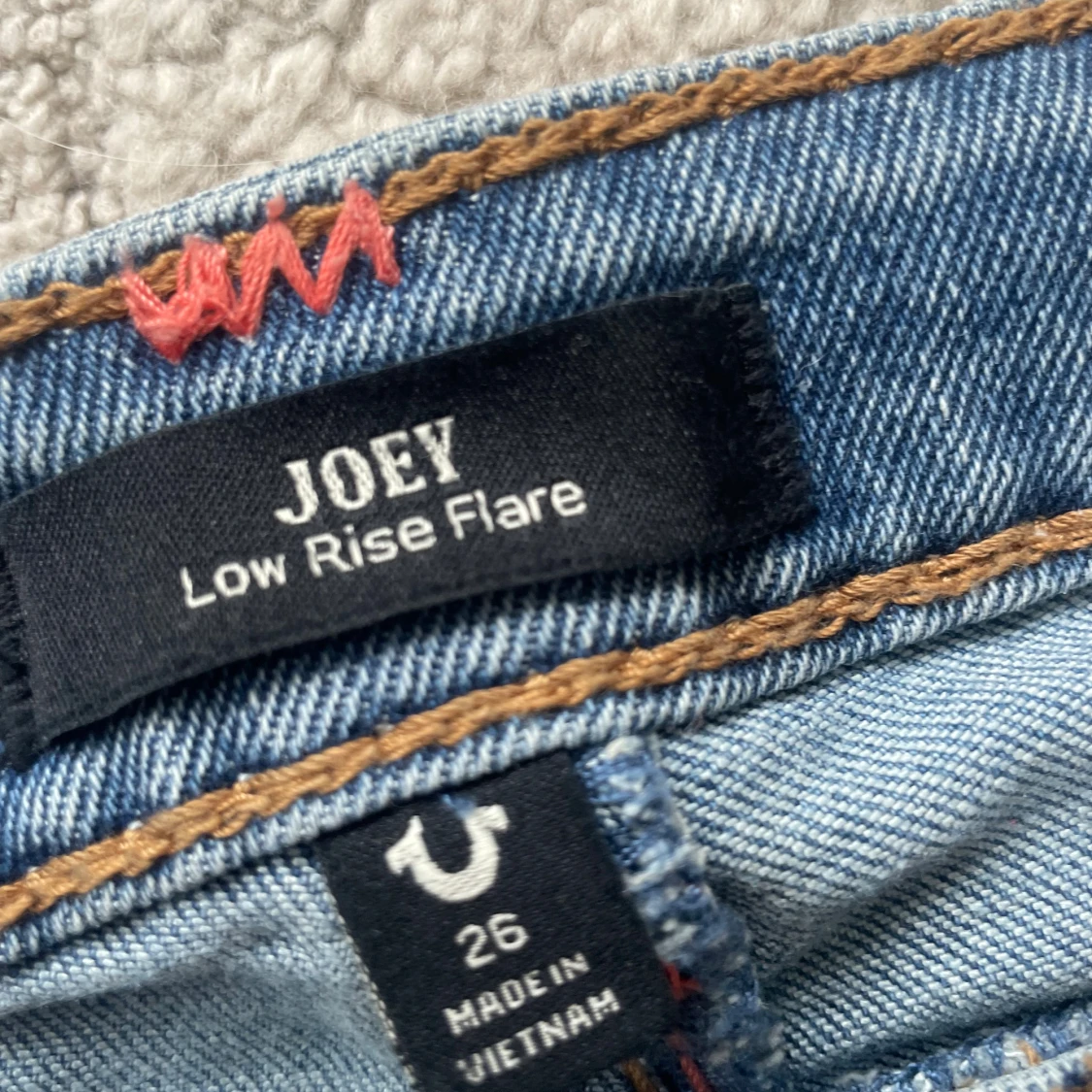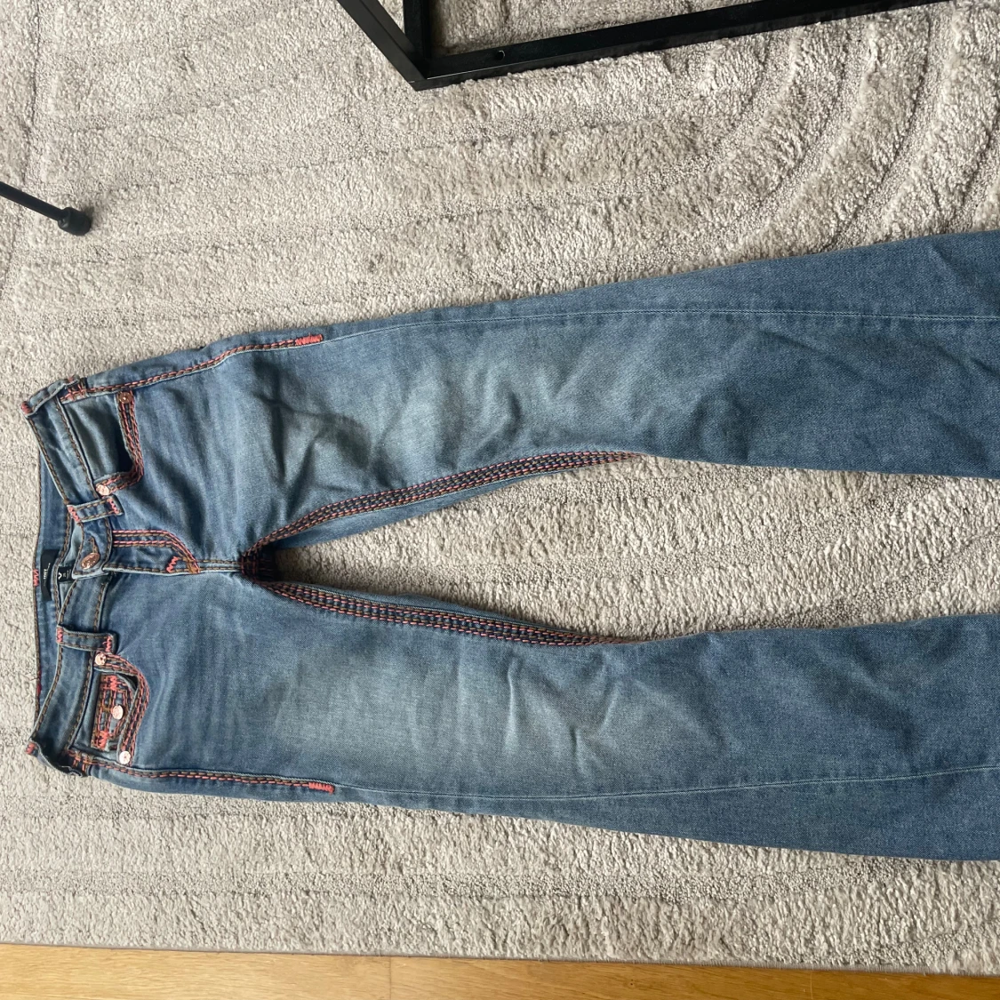 Säljer ett par ljusblå True Religion Joey jeans med låg midja och bootcut/flare passform. Jeansen har tydliga orange kontrastsömmar, dekorativa ficklock med knappar och klassisk True Religion-logga bak. Tillverkade i jeansmaterial med snygg tvätt och detaljer.
