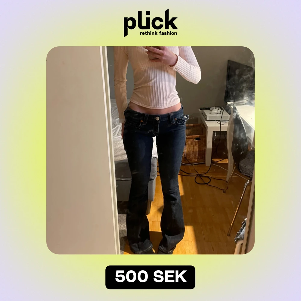 Säljer ett par snygga True Religion jeans i modellen Joey Low Rise Flare köpta från Nelly De är i ett bra skick och i storlek 24.
