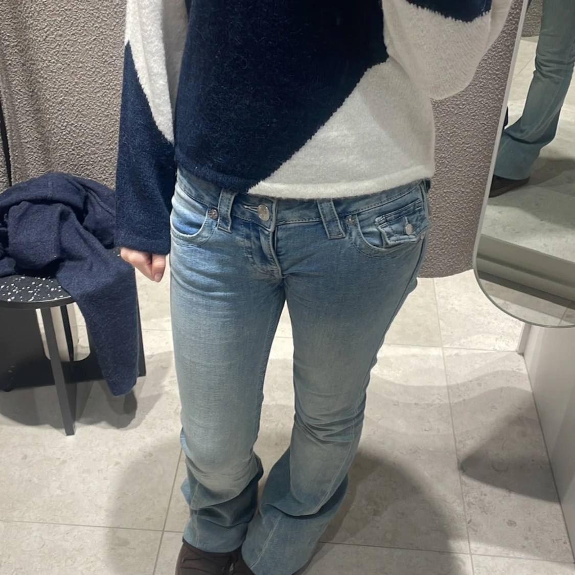 Säljer ett par ikoniska True Religion Joey jeans i ljusblå tvätt med låg midja och utsvängda ben. Klassiska detaljer som markerade sömmar, snygga bakfickor med lock och silverfärgade knappar. Perfekta för dig som gillar en retro och trendig look. Dem är nästan helt nya endast avspända ett fåtal gånger Skriv för fler bilder/frågor! ⚠️INTRESSEKOLL⚠️
